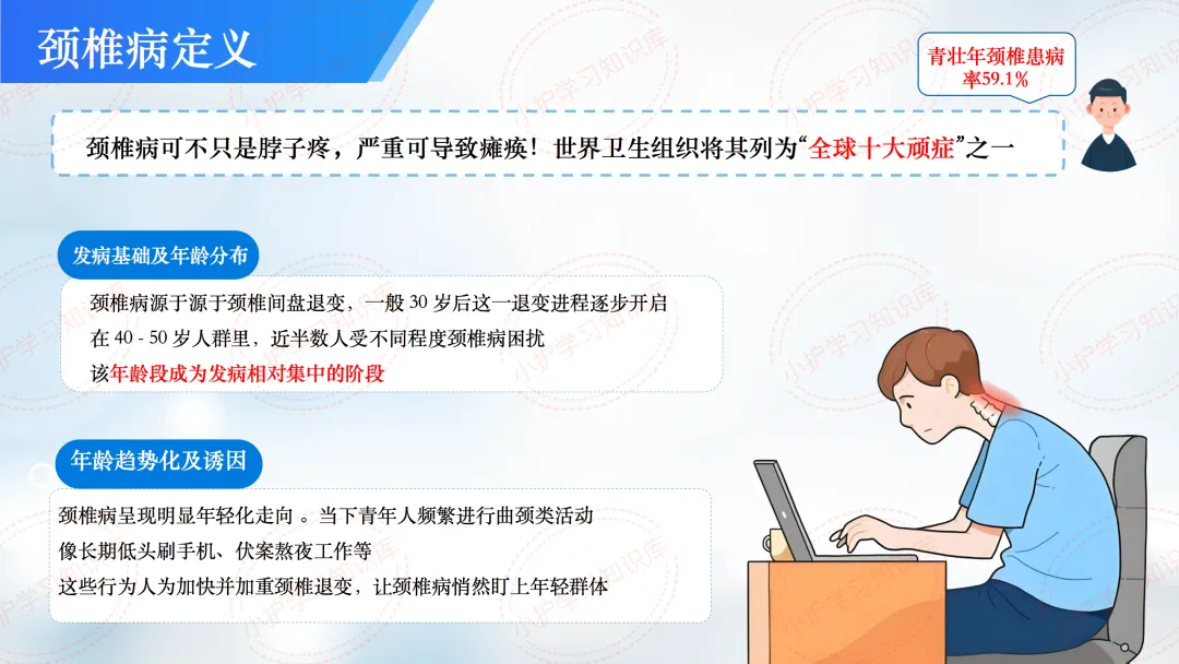 青壮年颈椎患病率高达59.1%,40-50岁人群中近半数受其困扰。