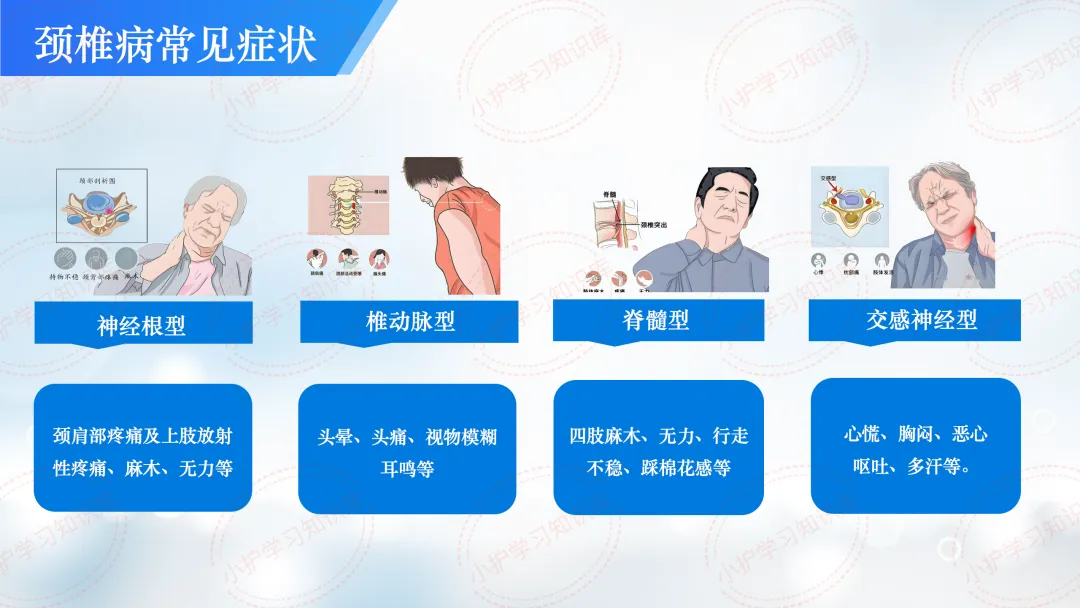 颈椎病的症状复杂多样,根据病因和临床表现主要分为四型: