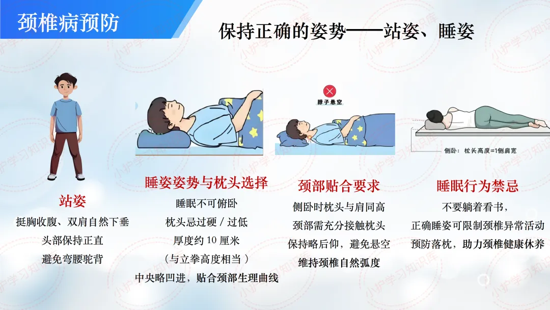 睡姿不可俯卧,枕头忌过硬或过低,厚度约10厘米(与立拳高度相当),略凹进以贴合颈部生理曲线。