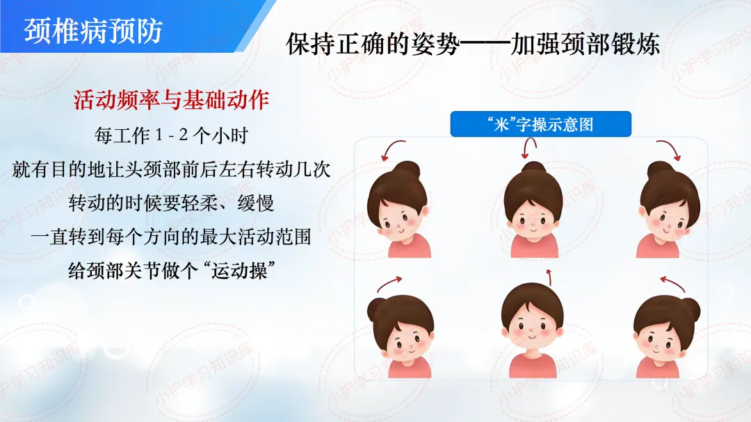 建议每工作1-2小时,就有目的地让头颈部前后左右轻柔、缓慢地转动几次,转到每个方向的最大活动范围。