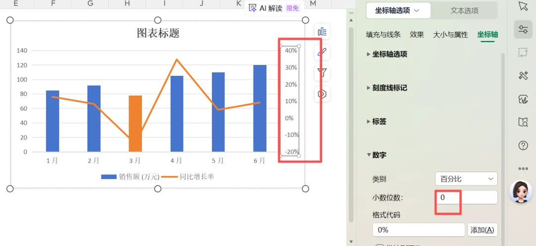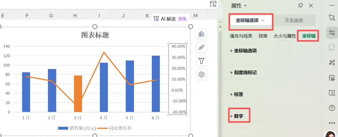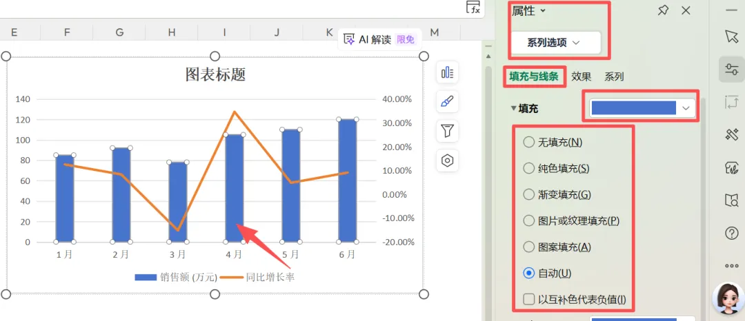 图表美化,除了文字的字体、大小、颜色可以改变,系列填充颜色可以根据公司主题色进行相应调整。选中系列,在属性-系列选项中-填充与线条,可以进行纯色填充,也可以无填充,各种填充方式应有尽有。无填充一般是作为辅助列时可以使用,后期讲解小技巧时作为专题写一篇。系列中某一条数据需要重点关注时,可以连续双击这一根柱子,即可单独选中,再进行特殊调色。当数字格式不符合预期,比如坐标轴可能数字比较大,界面显得比较挤的时候,想把两位小数点改为没有小数点。将小数位数改为0,enter键后即可得到如下图所示结果:有问题留言区交流