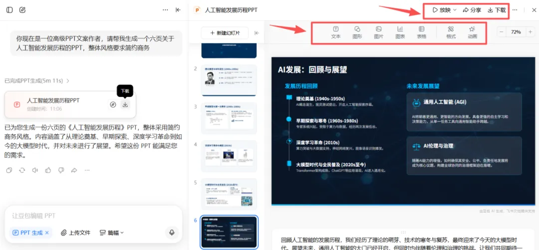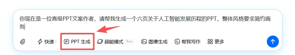 直接在豆包网页版或APP里搜索“PPT助手”,然后按“主题 + 页数 + 风格”的公式输入需求,比如:“你现在是一位高级PPT文案作者,请帮我生成一个六页关于人工智能发展历程的PPT,整体风格要求简约商务”。