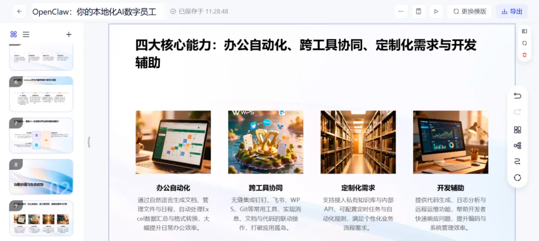 不到一分钟,一份可直接编辑的PPT文件就自动生成了,文字、配图都能在线随意调整。不用熬夜,不用求人,指令越清晰,PPT生成越精准。