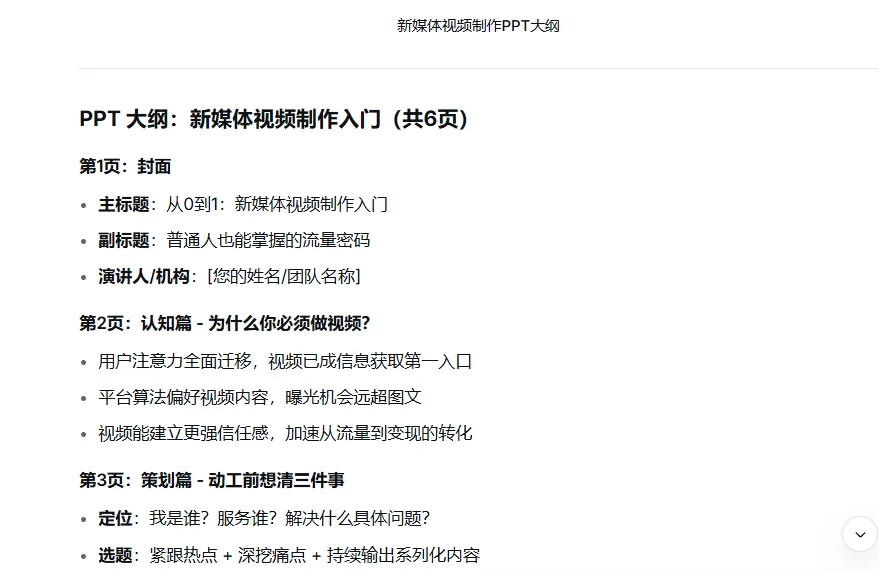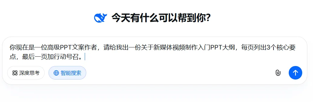 DeepSeek虽然主要针对文字处理,但只要指令给得精准,同样能帮我们高效生成PPT大纲。打开DeepSeek网页版,输入类似这样的要求:“你现在是一位高级PPT文案作者,请给我出一份关于新媒体视频制作入门PPT大纲,每页列出3个核心要点,最后一页加行动号召。”