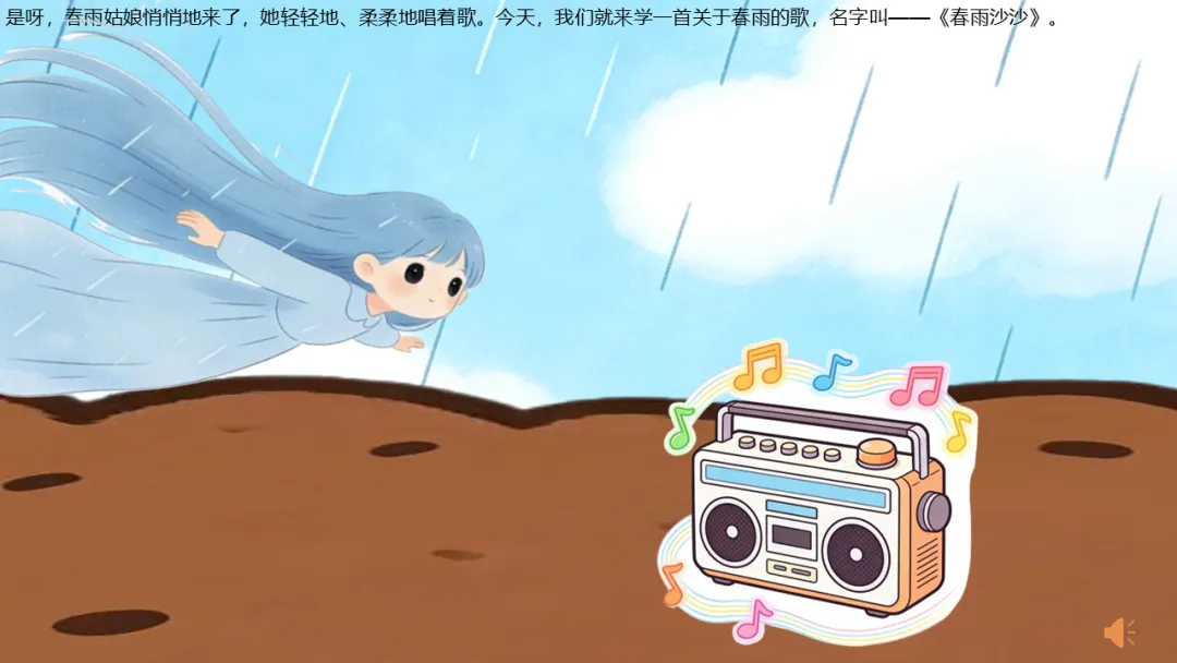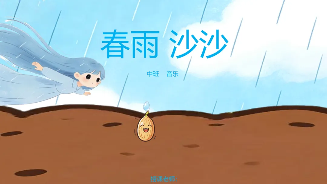 “是呀,春雨姑娘悄悄地来了,她轻轻地、柔柔地唱着歌。今天,我们就来学一首关于春雨的歌,名字叫——《春雨沙沙》。”