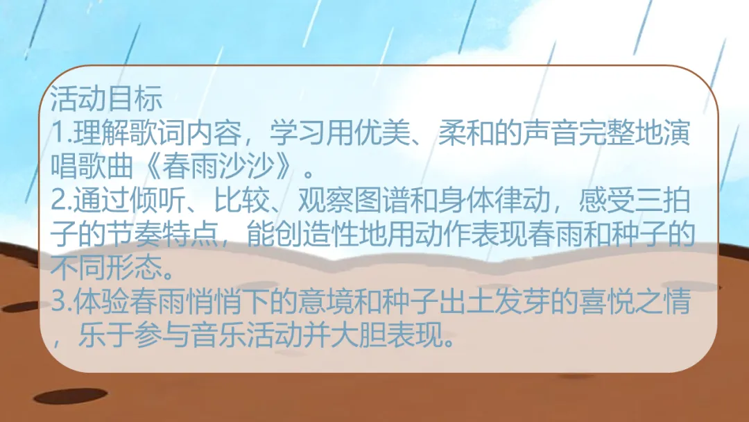 1.理解歌词内容,学习用优美、柔和的声音完整地演唱歌曲《春雨沙沙》。