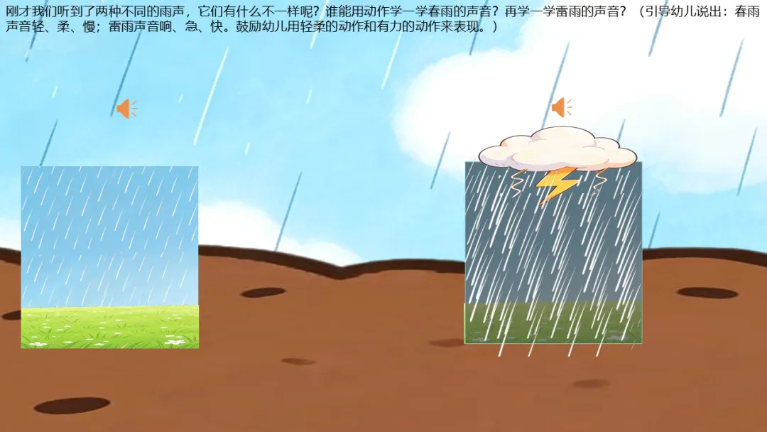 “刚才我们听到了两种不同的雨声,它们有什么不一样呢?谁能用动作学一学春雨的声音?再学一学雷雨的声音?”