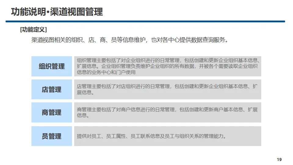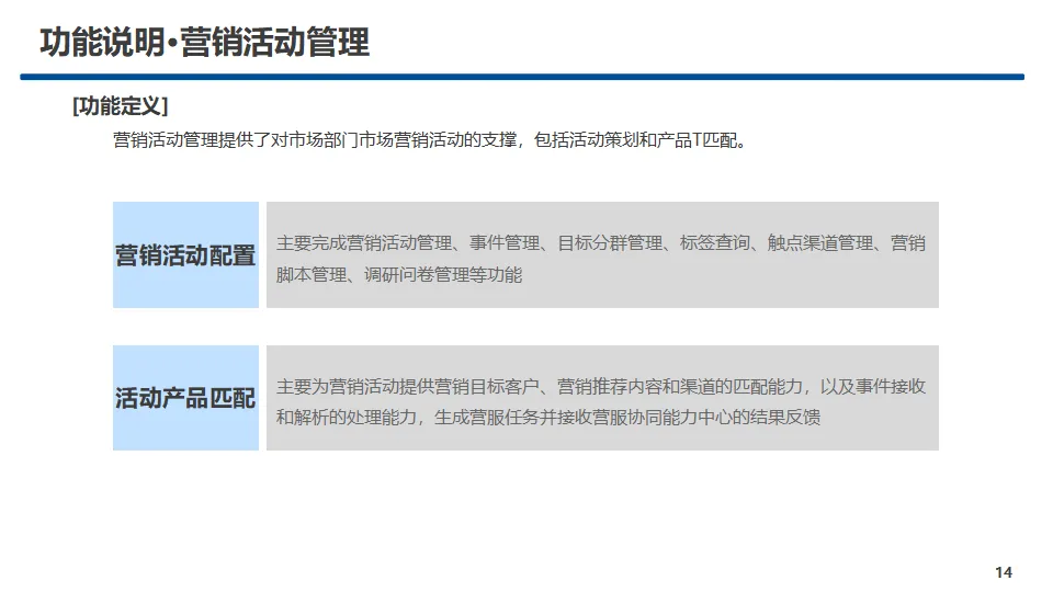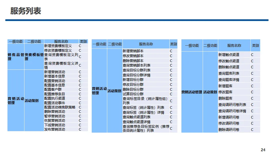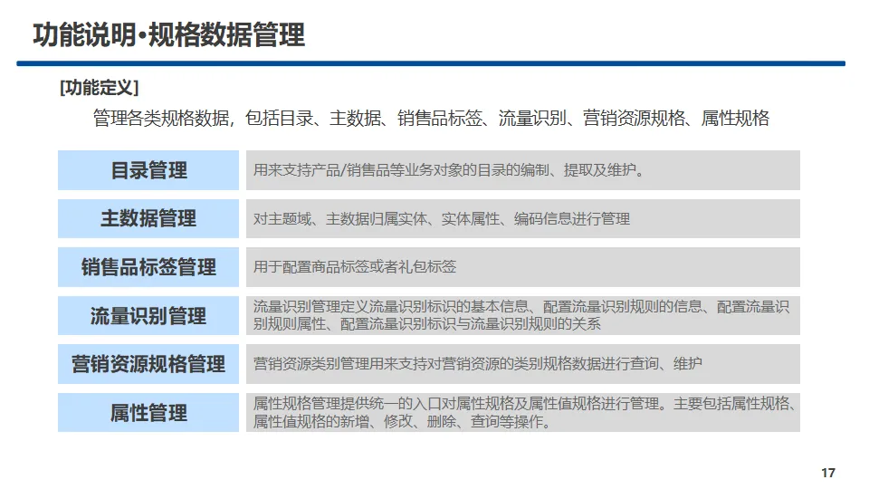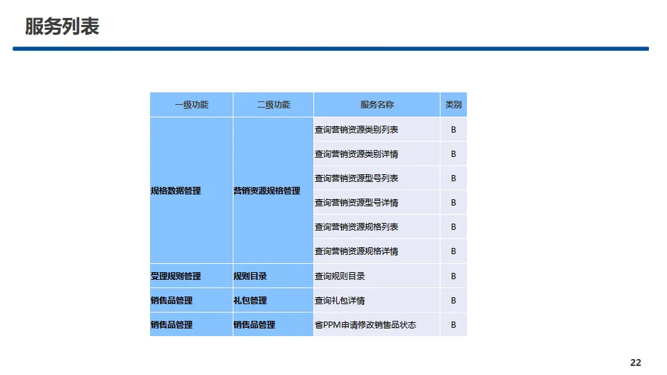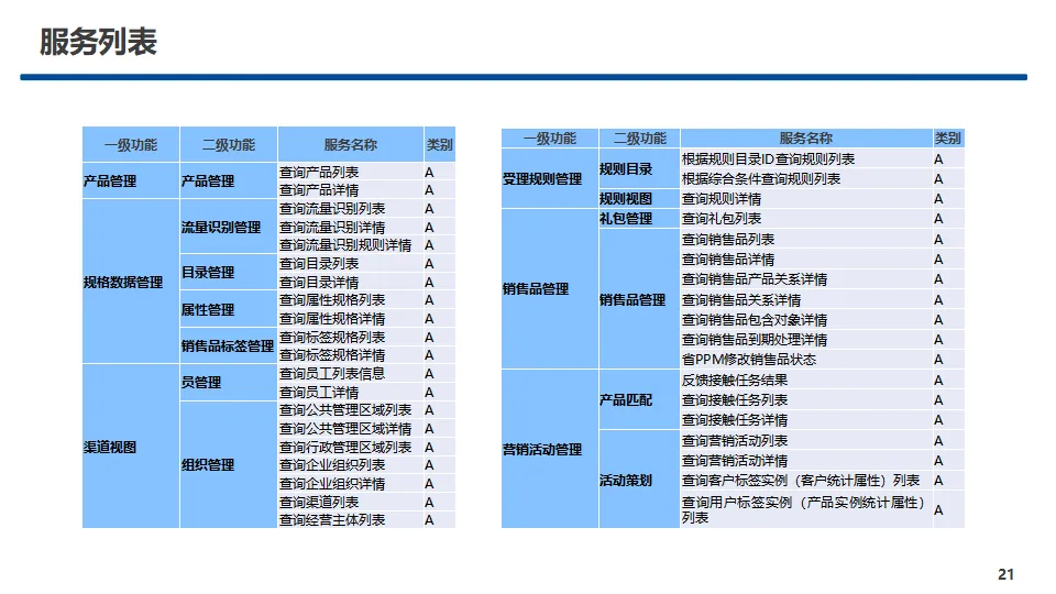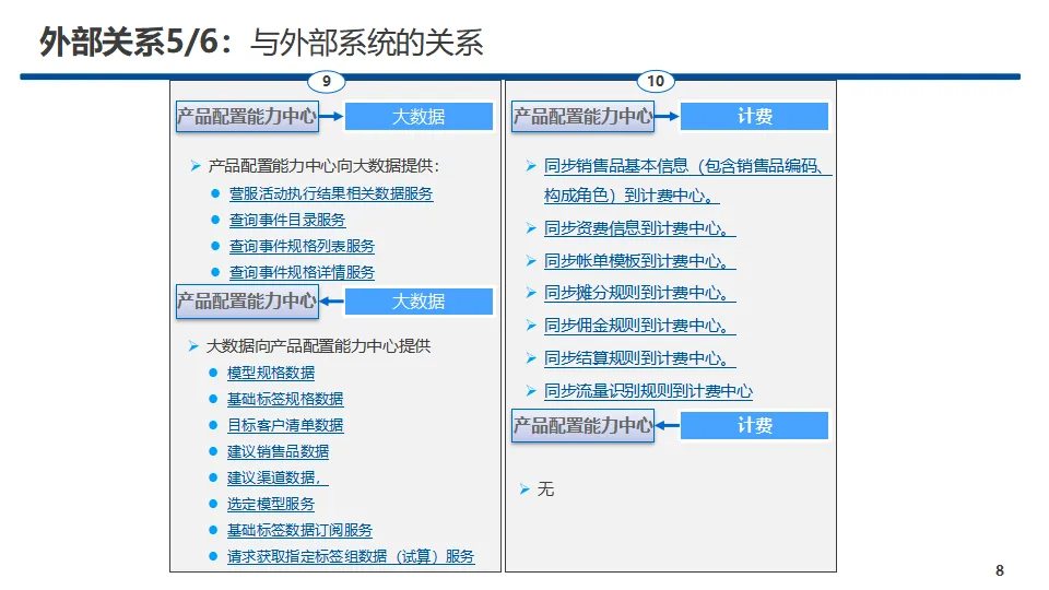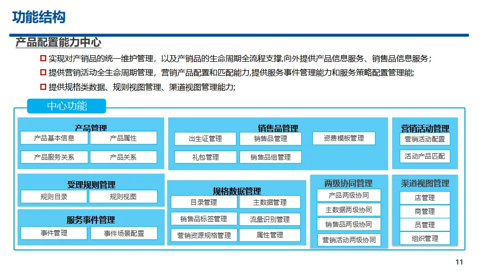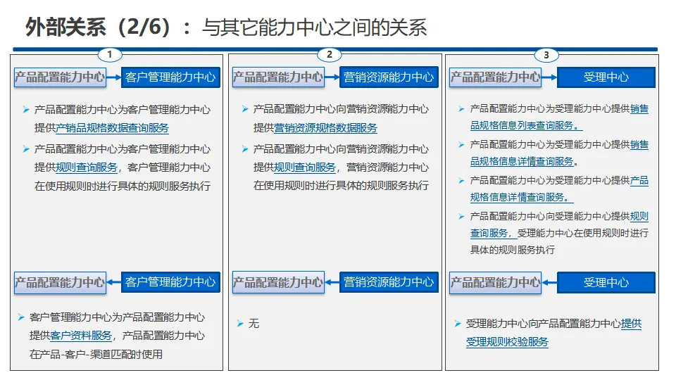 中心核心功能覆盖产品管理、销售品管理、营销活动管理、受理规则管理、服务事件管理、规格数据管理、两级协同管理、渠道视图管理八大模块,实现产品与销售品全生命周期管控、规则统一配置视图、营销活动闭环运营、主数据标准化管理及省-上级两级业务协同。方案提供A、B、C三类标准化服务接口,覆盖查询、配置、新增、修改、删除等全操作能力,明确服务入参、出参与实体对象规范,保障跨中心、跨系统高效互通。