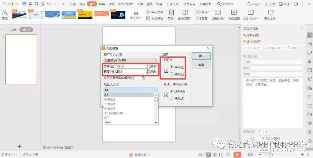 除此之外,PPT还可以自定义幻灯片大小,选择“设计”——“幻灯片大小”——“自定义大小”——输入你想要的尺寸,方向即可。