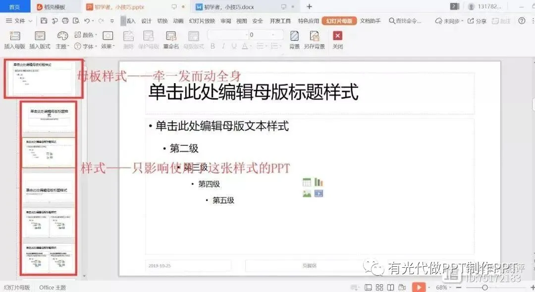 母板样式:它变,所有ppt都跟着变。