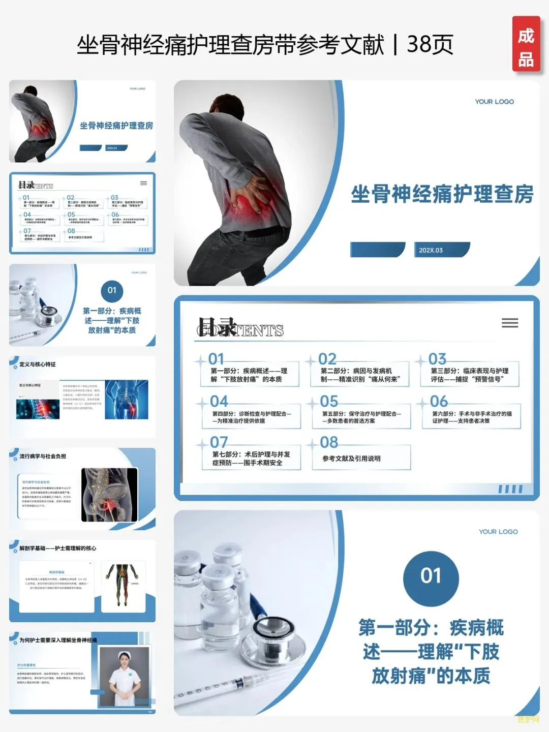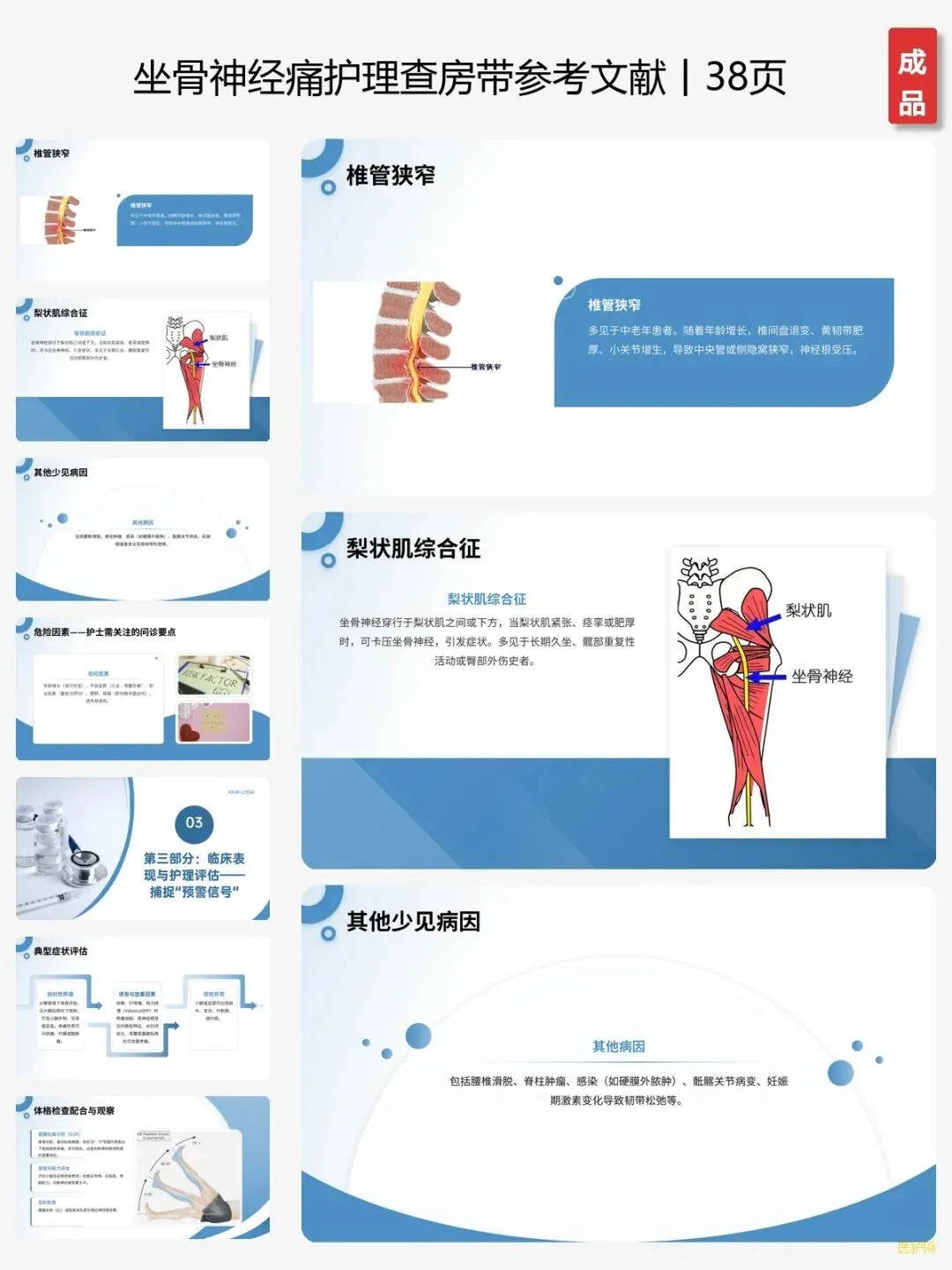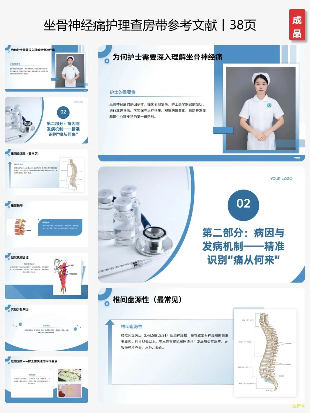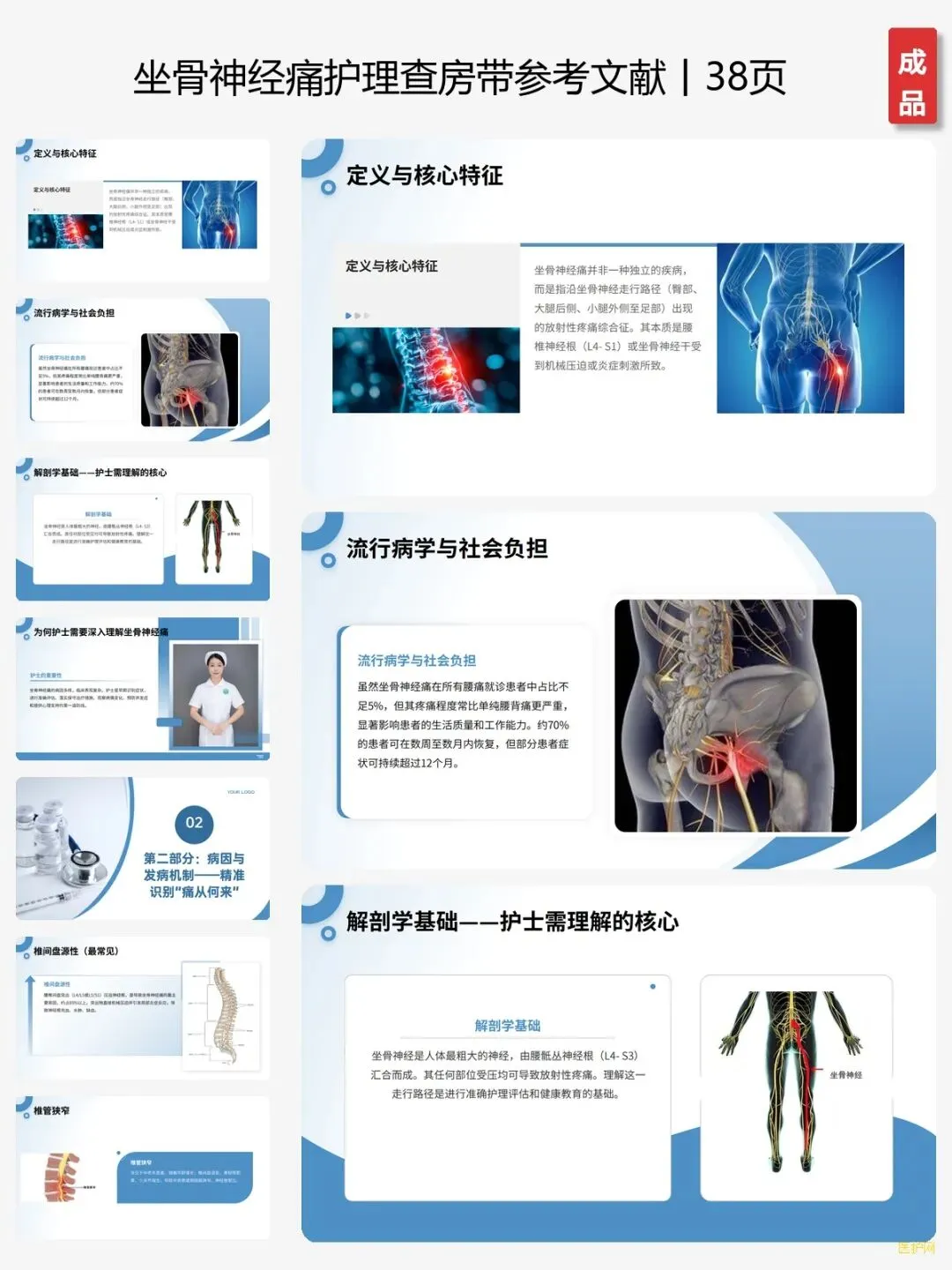 坐骨神经痛的护理知识PPT38页分享,不管是患者还是护理从业者,了解这些都能更好地应对这种常见的腰腿疼痛问题。坐骨神经痛不是独立疾病,而是臀部到足部的放射性疼痛,八成以上由腰椎间盘突出引起,久坐、弯腰负重、肥胖都是危险因素,咳嗽、弯腰时疼痛会加重,大家要格外留意。