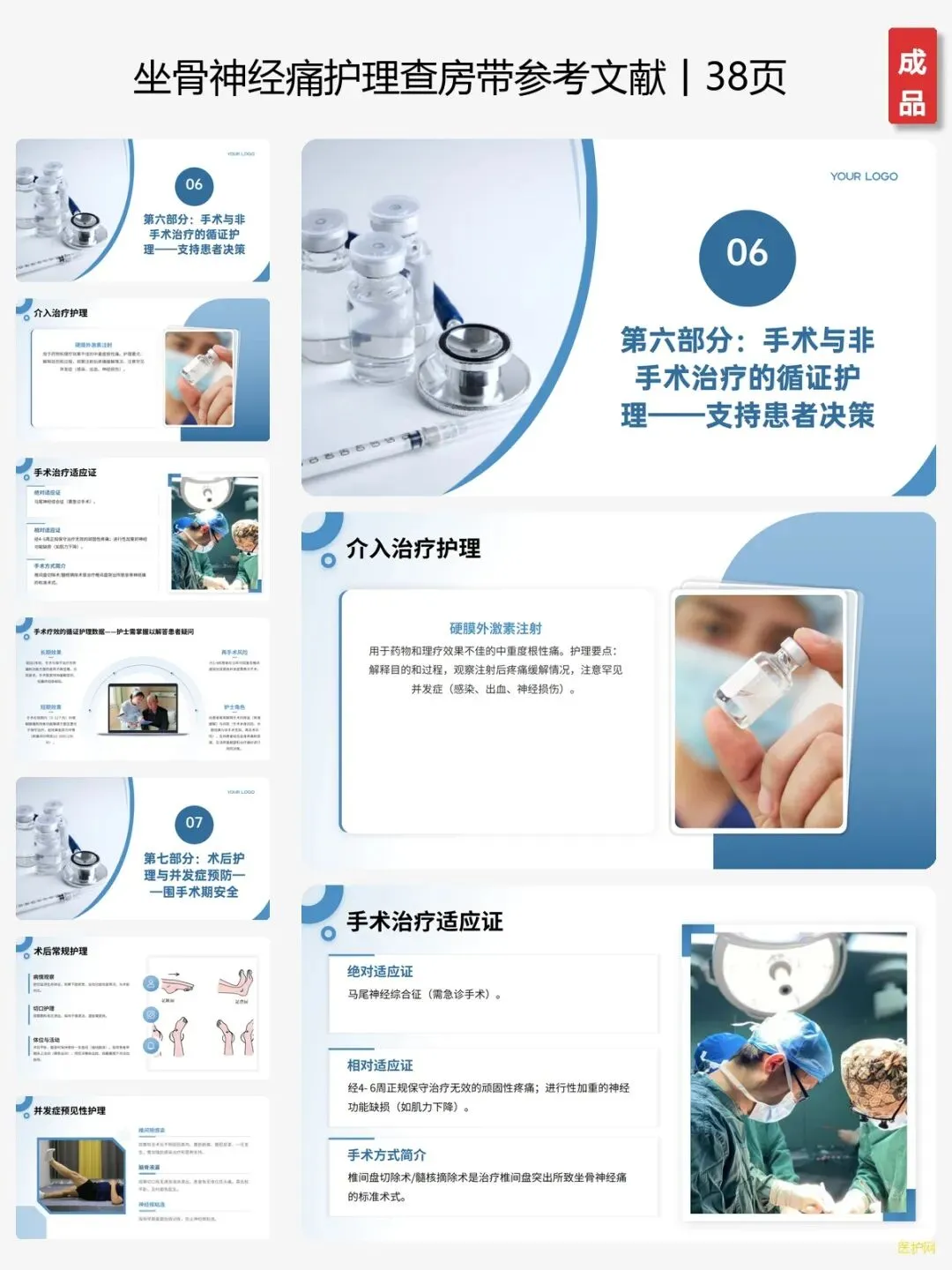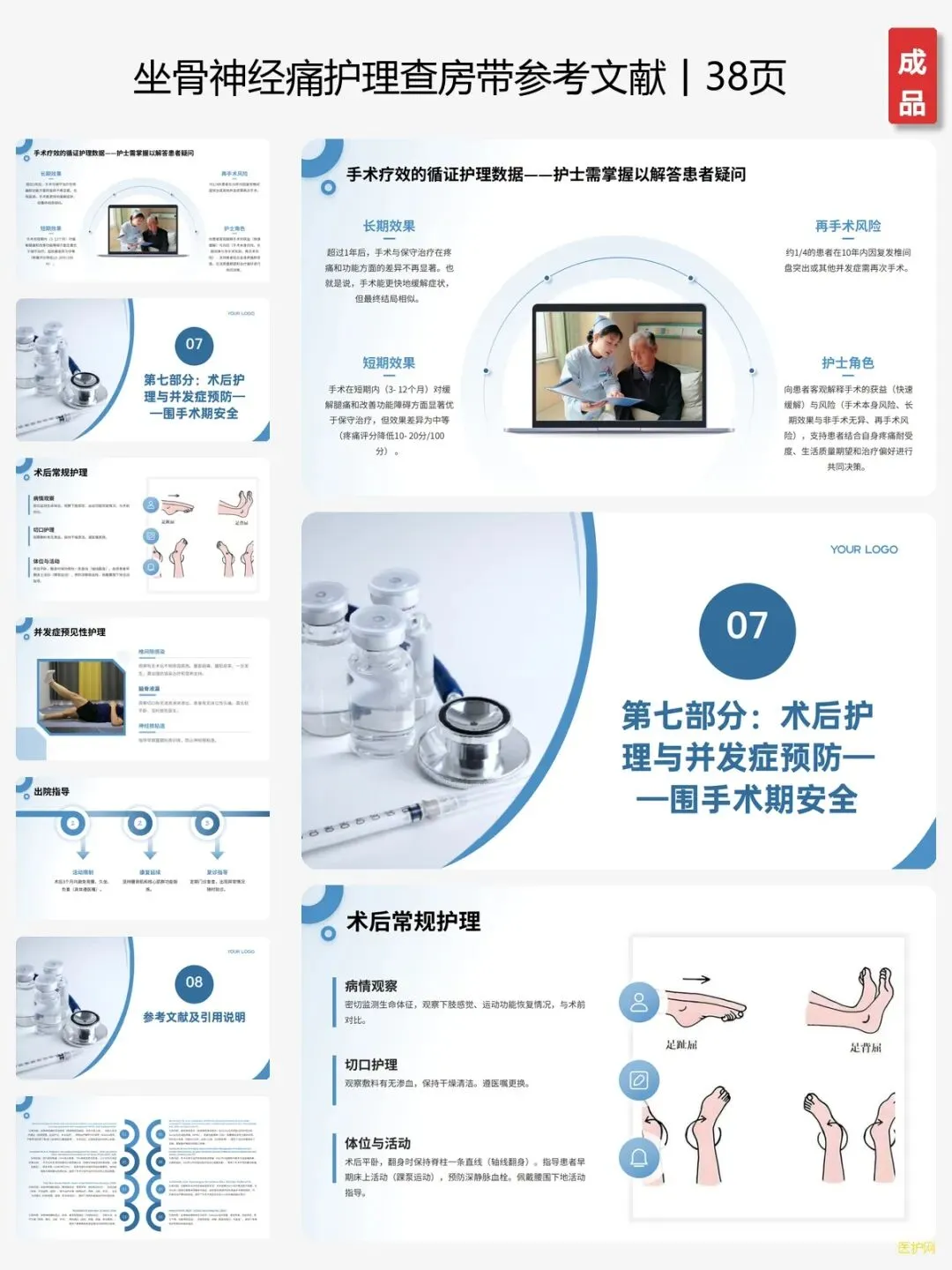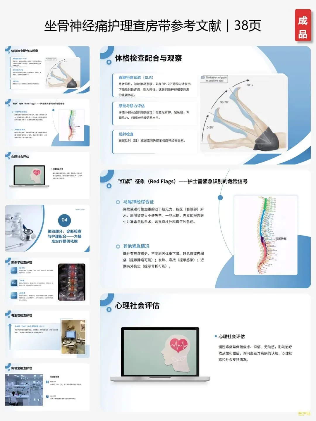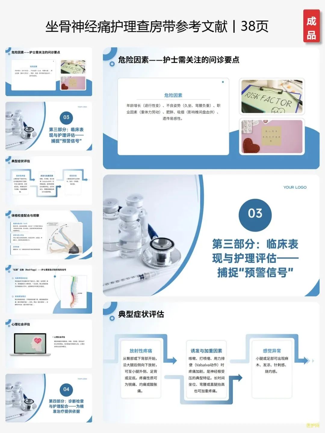 坐骨神经痛的护理知识PPT38页分享,不管是患者还是护理从业者,了解这些都能更好地应对这种常见的腰腿疼痛问题。坐骨神经痛不是独立疾病,而是臀部到足部的放射性疼痛,八成以上由腰椎间盘突出引起,久坐、弯腰负重、肥胖都是危险因素,咳嗽、弯腰时疼痛会加重,大家要格外留意。
