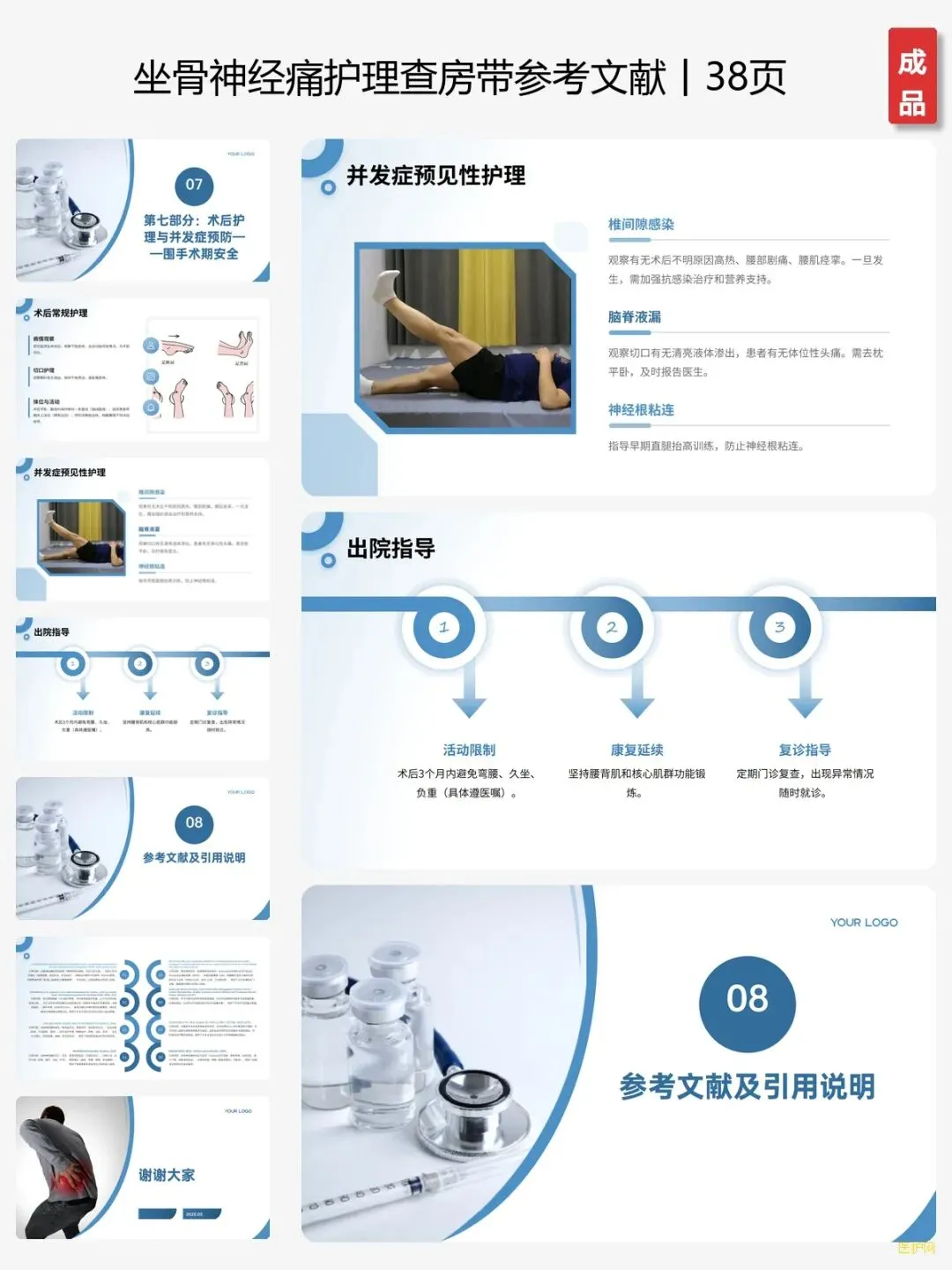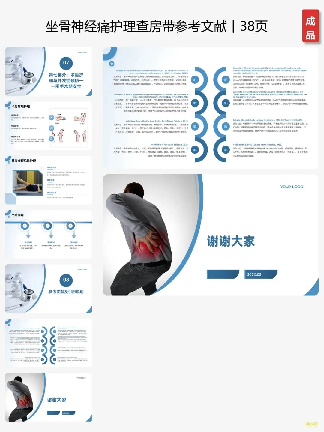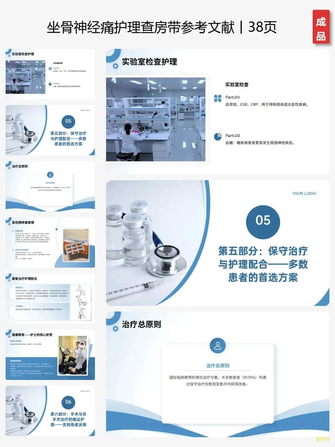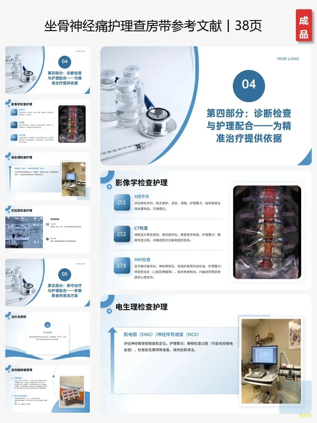 坐骨神经痛的护理知识PPT38页分享,不管是患者还是护理从业者,了解这些都能更好地应对这种常见的腰腿疼痛问题。坐骨神经痛不是独立疾病,而是臀部到足部的放射性疼痛,八成以上由腰椎间盘突出引起,久坐、弯腰负重、肥胖都是危险因素,咳嗽、弯腰时疼痛会加重,大家要格外留意。