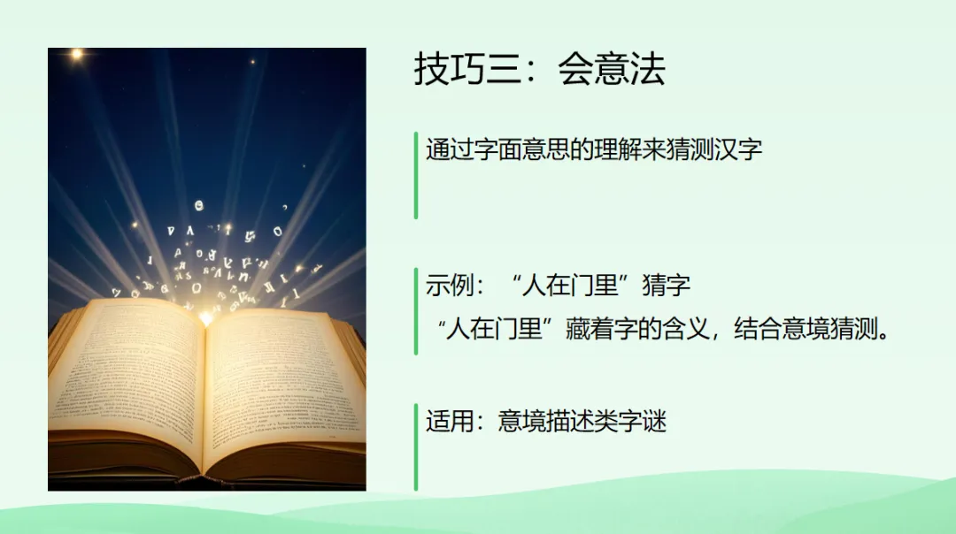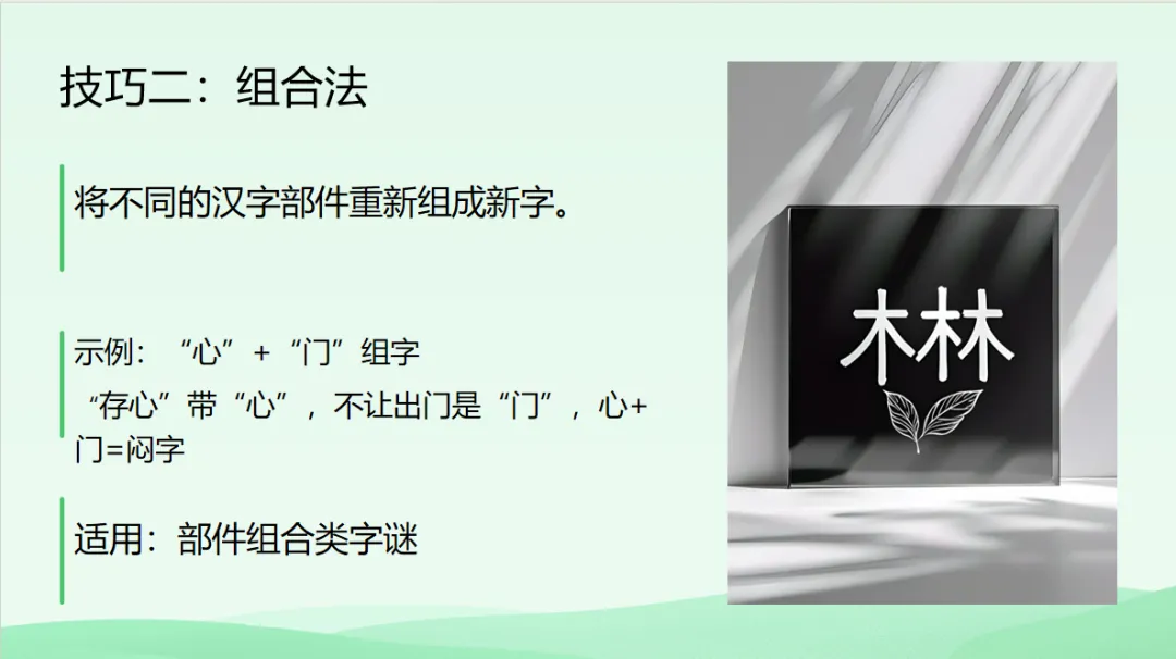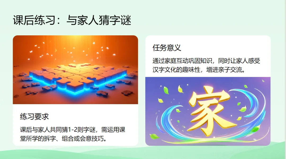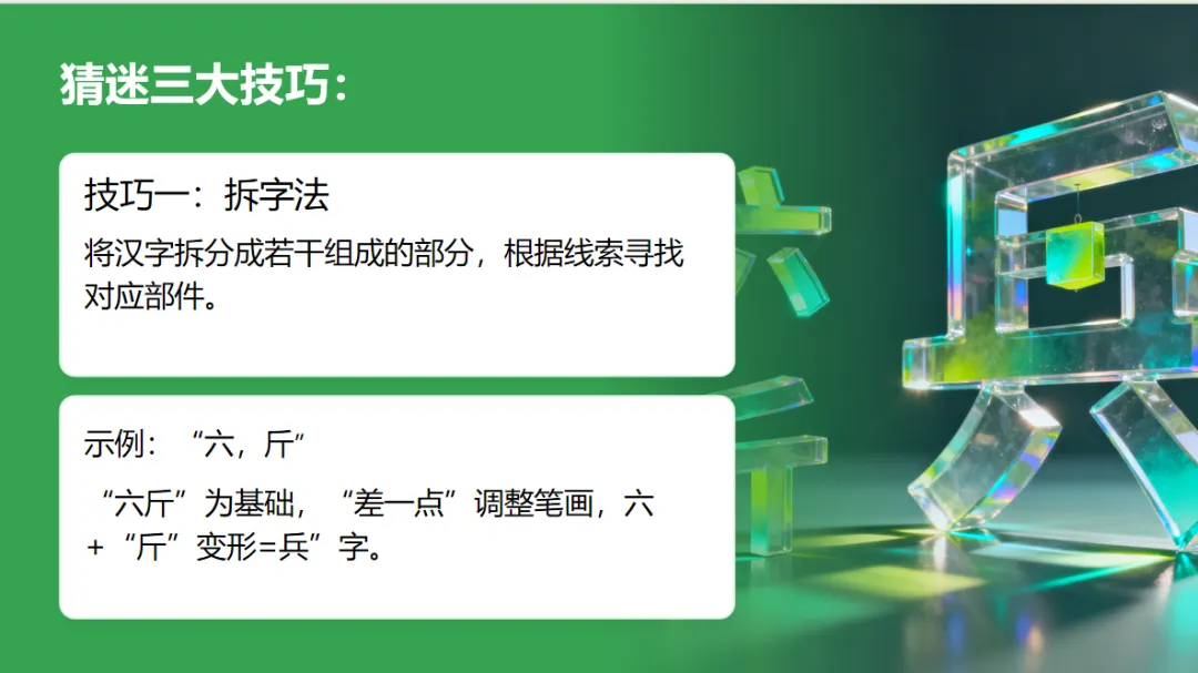 现在,所有准备工作都完成了:PPT排版清晰,课件里包含了字谜背景和猜谜技巧。接下来,我和组员一起排练,就能正式上台展示了。