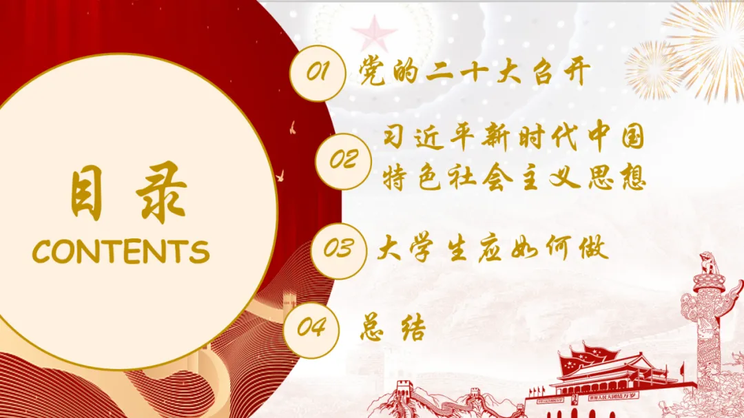习近平总书记说:“新时代是追梦者的时代,也是广大青少年成就梦想的时代。希望你们心系祖国,志存高远,脚踏实地,在奋斗中创造精彩人生,为祖国和人民贡献青春和力量。”此次大赛,我们紧扣主题进行PPT创作,我们作品采用了红黄为底,白色为辅为PPT的颜色基调,整体基调质感明显,风格鲜明。主题紧扣党的二十大精神以及习近平新时代中国特色社会主义思想,选取了具有中国代表性的华表、红丝绸、和平鸽、党徽等素材进行PPT创作;意在启发新时代新青年要保持“不忘初心,砥砺前行”的精神,为全面建设社会主义现代化国家、全面推进中华民族伟大复兴而团结奋斗!