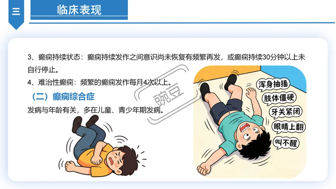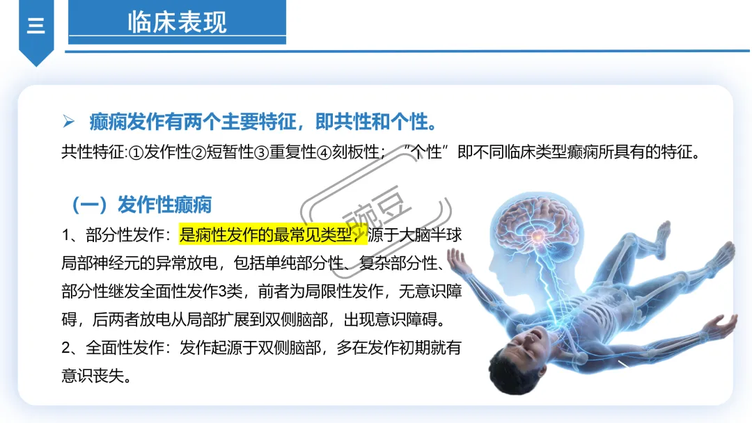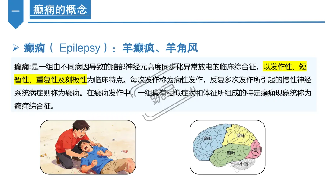 癫痫是一组由不同病因导致的脑部神经元高度同步化异常放电的临床综合征,以发作性、短暂性、重复性及刻板性为临床特点。每次发作称为痫性发作,反复多次发作所引起的慢性神经系统病症则称为癫痫。在癫痫发作中,一组具有相似症状和体征所组成的特定癫痫现象统称为癫痫综合征。