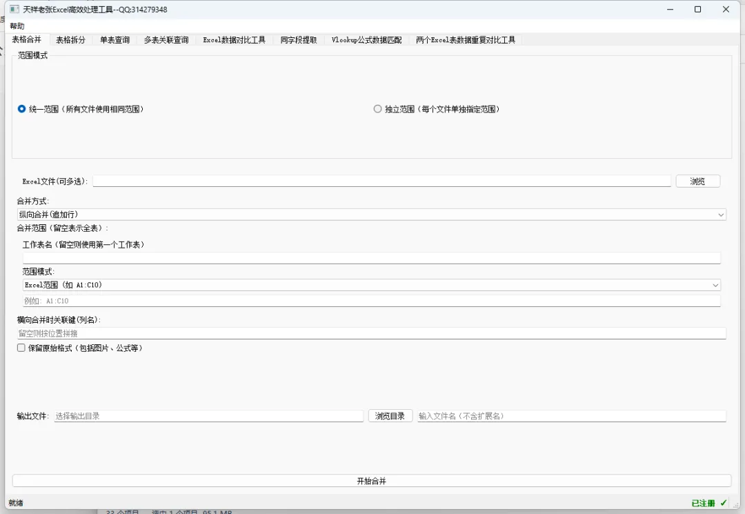 | 纵向追加行 / 横向按列拼接,支持统一范围或独立范围 |