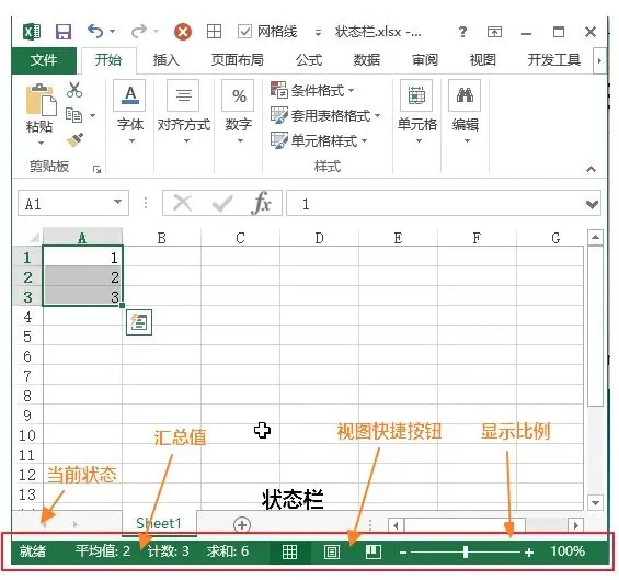 Excel窗口最底部细长栏目:打字编辑时显示「编辑」,回车确认后显示「就绪」;选中多组数字,会自动算出总和、平均值、数量,不用手动按计算器。