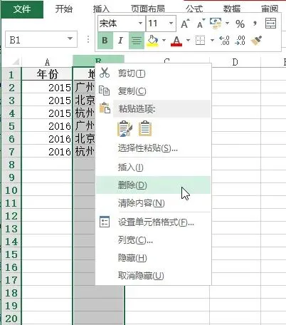 2、右键点击删除,按需调整周边数据的填补方式