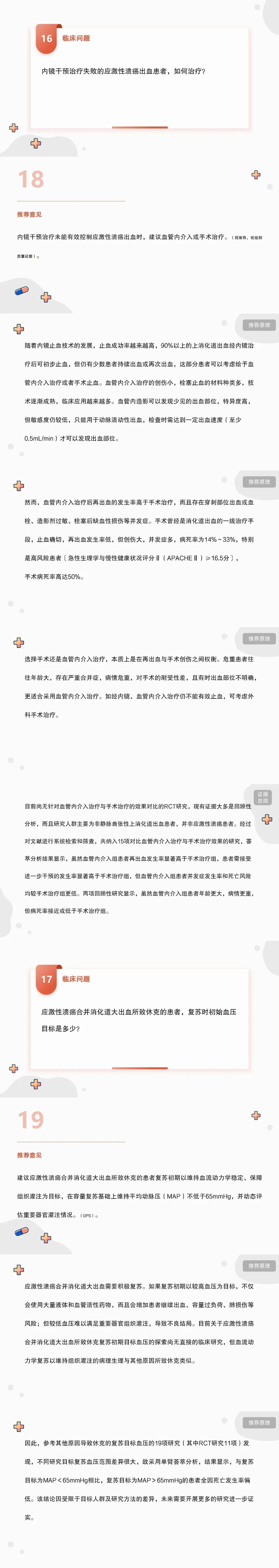19.建议应激性溃疡合并消化道大出血所致休克的患者复苏初期以维持血流动力学稳定、保障组织灌注为目标,在容量复苏基础上维持平均动脉压(MAP)不低于65mmHg,并动态评估重要器官灌注情况。