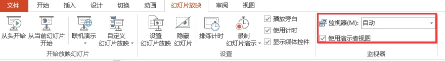 1、打开PPT后,在【幻灯片放映】-【监视器】组中勾选“演示者视图”复选框,监视器选择“自动”,然后点击最左方“从头开始”按钮放映幻灯片,同样可进入演示者视图。
