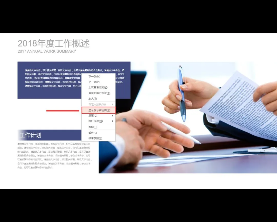 大部分人演讲时,都是直接放映幻灯片。这样的缺点就是自己和观众看到的PPT内容完全相同,哪怕点击个鼠标右键,观众也一览无余。