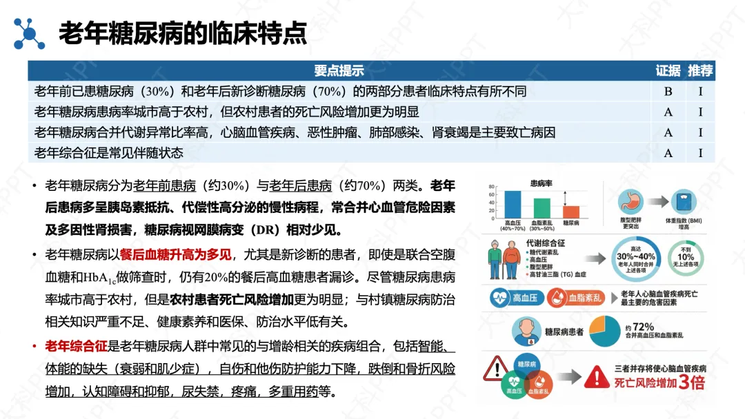 老年糖尿病分为老年前患病(约 30%)和老年后新发(约 70%),后者以胰岛素抵抗、餐后血糖升高为典型表现,更易合并心血管风险与肾功能损伤;前者胰岛功能差,并发症更多。该病城市患病率更高,但农村患者死亡风险更突出,且 90% 合并超重 / 肥胖、高血压、血脂异常等代谢问题,心脑血管病、感染、肾衰竭为主要死因,同时常伴衰弱、认知障碍、跌倒风险等老年综合征。