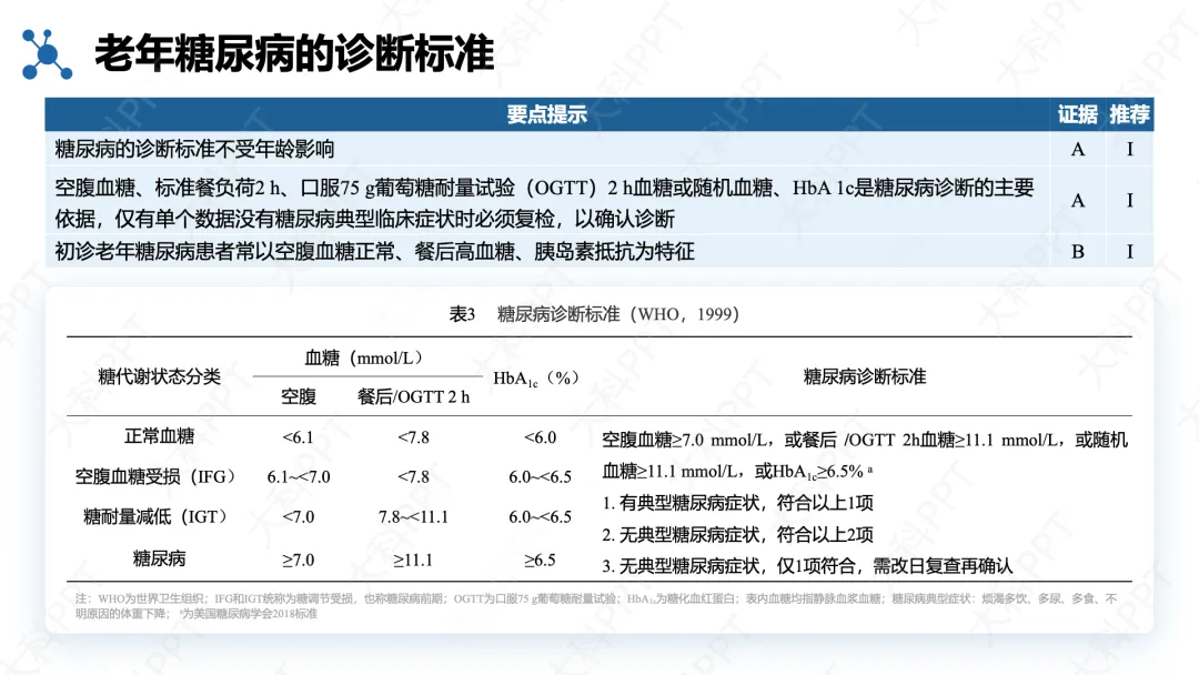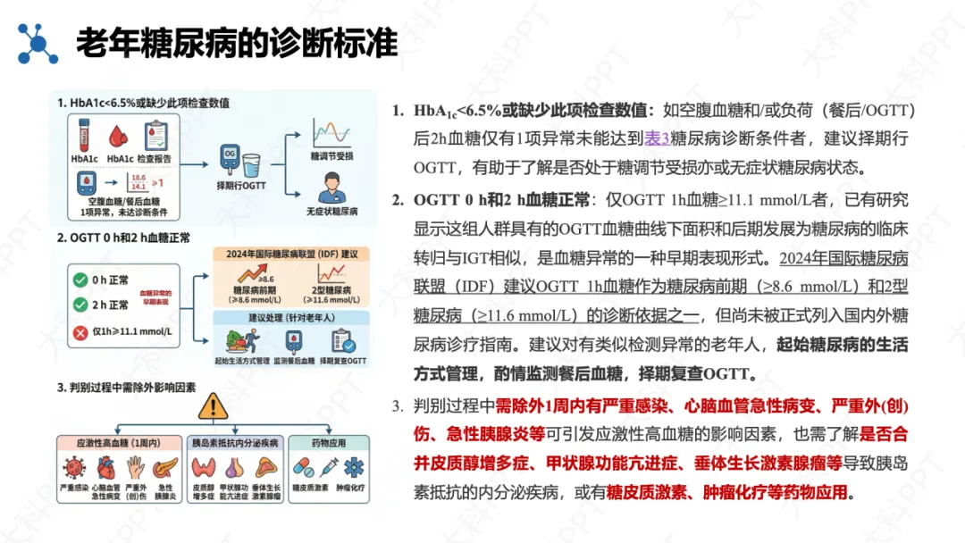 诊断标准与成人一致,依据空腹、餐后 2h、随机血糖及 HbA₁c 确诊,无症状者需复核,老年患者易因仅查空腹血糖而漏诊。