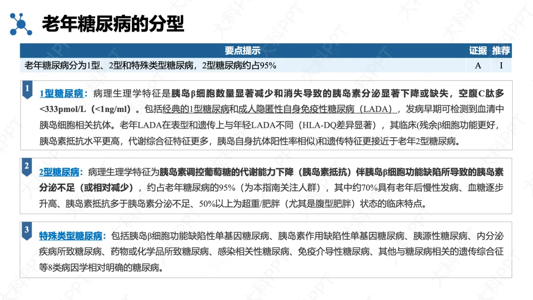 分型以 2 型为主(占 95%),少数为 1 型及特殊类型糖尿病,诊断时需排除应激性高血糖,并综合评估胰岛功能与合并症,为个体化治疗提供依据。