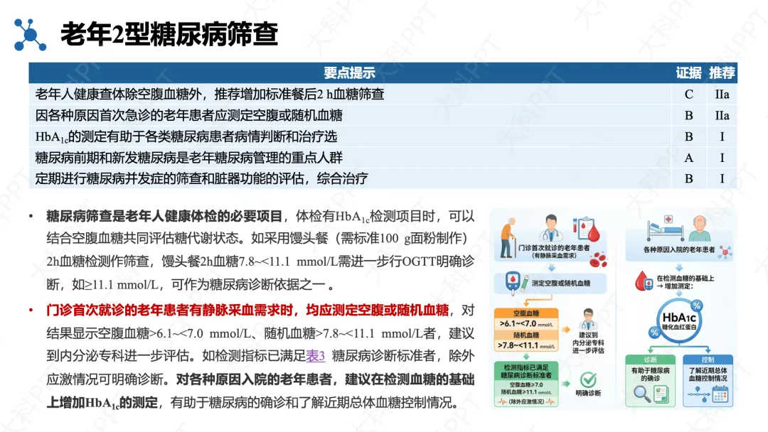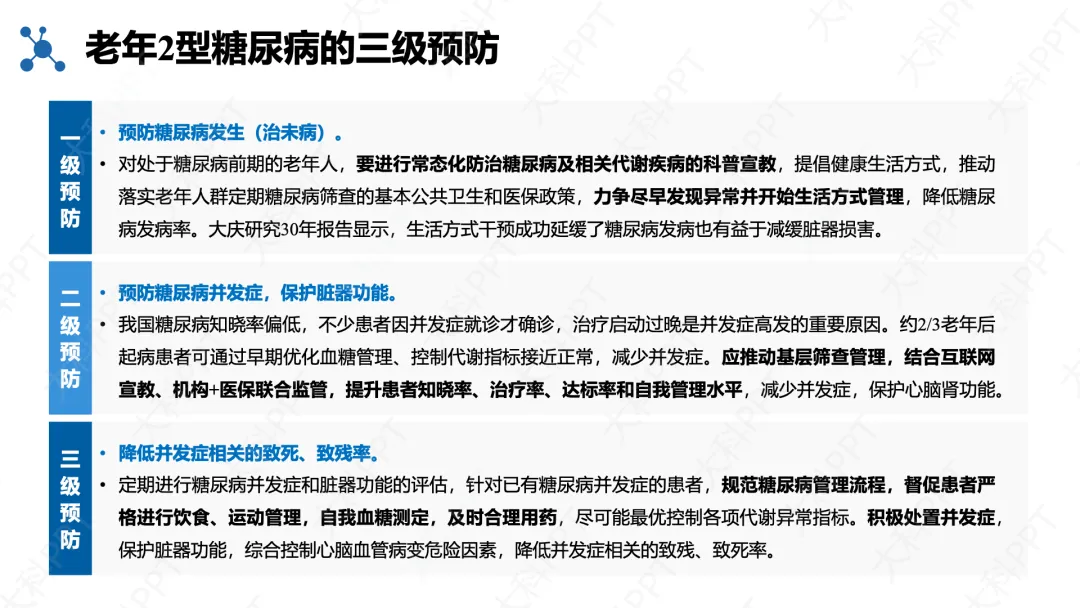 老年 2 型糖尿病筛查建议在常规空腹血糖基础上加测餐后 2 小时血糖,急诊患者常规检测血糖,通过三级预防实现全周期管理:一级预防针对前期人群干预生活方式,二级预防早诊早治减少并发症,三级预防规范管理降低致残致死率。