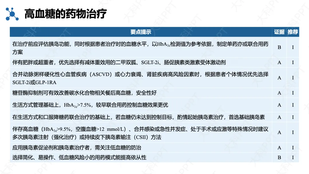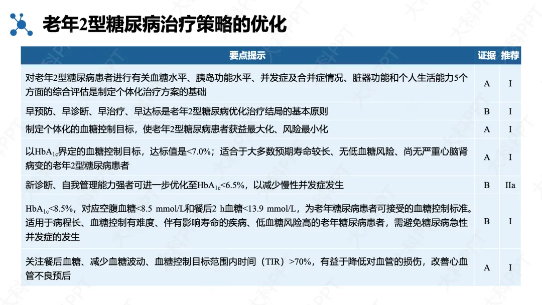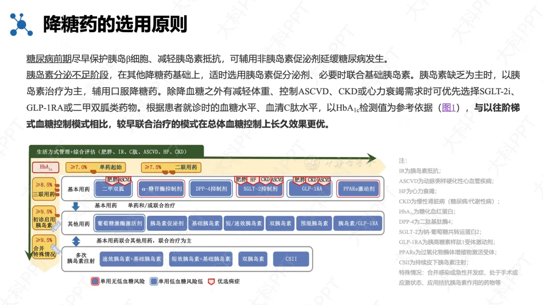 治疗以综合评估为基础,遵循 “四早” 原则,按患者健康状况分层设定血糖目标,兼顾获益与低血糖风险,优先选用安全、简便的降糖方案。