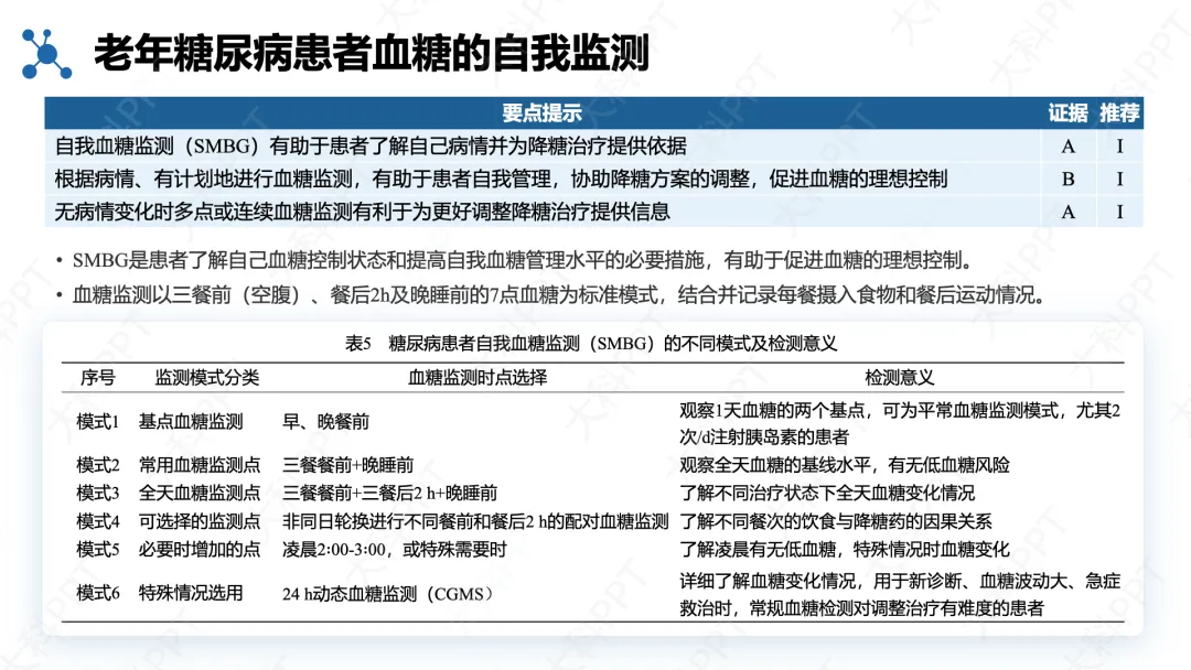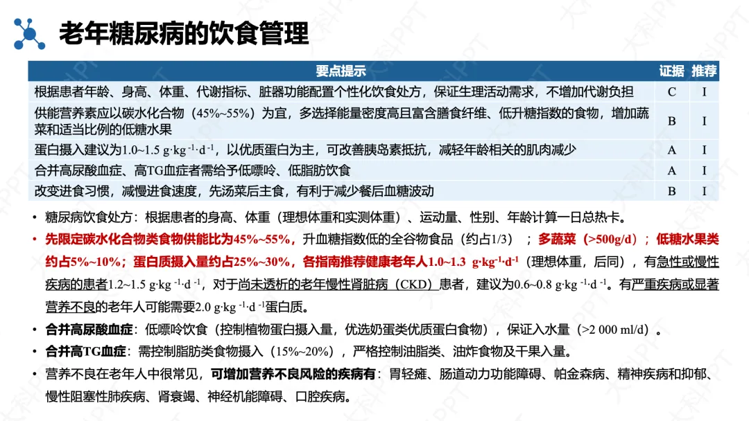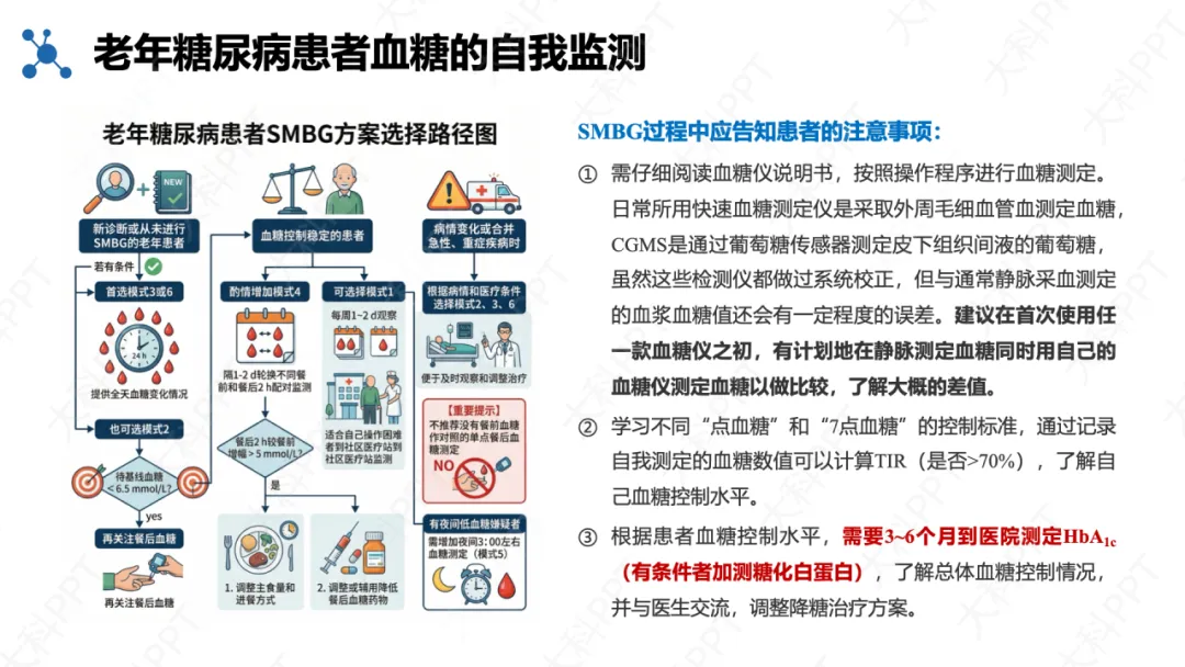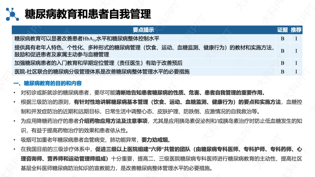 糖尿病教育与自我管理是核心环节,采用适合老年人的个性化教育形式,落实 “四会” 要求,推动医院 - 社区联合管理,鼓励家属参与,帮助患者掌握饮食、运动、监测和用药技能,提高治疗依从性与血糖达标率,最终改善长期预后。(仅展示部分ppt)