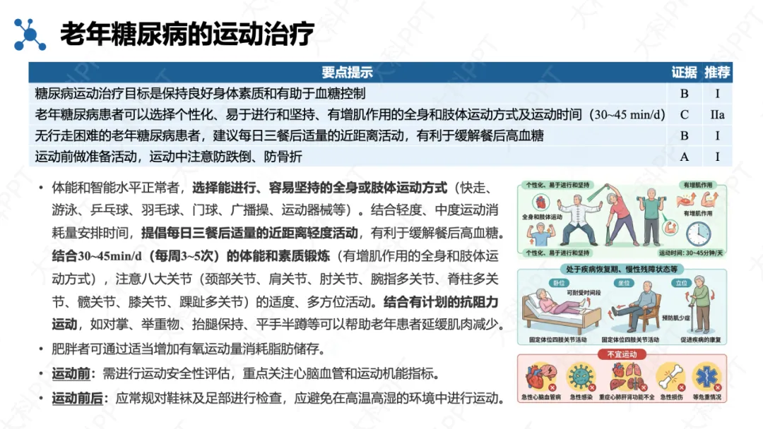 运动治疗以安全、易坚持为原则,每日 30~45 分钟,推荐餐后适度活动与抗阻训练结合,改善餐后高血糖并延缓肌少症,运动全程注重防跌倒、防骨折,危重及体弱患者可进行床上或坐位关节活动。