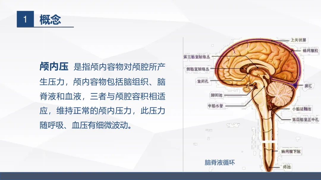 :颅内容物对颅腔所产生的压力,颅内容物包括脑组织、脑脊液和血液,三者与颅腔容积相适应,维持正常颅内压力,随呼吸、血压有细微波动。
