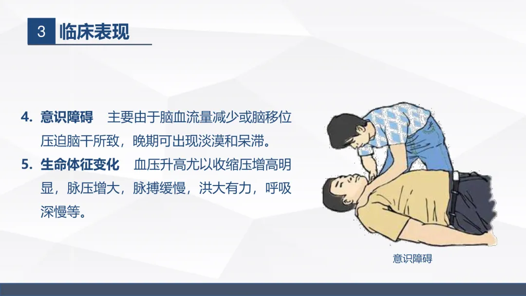 意识障碍:脑血流量减少或脑移位压迫脑干所致,晚期淡漠、呆滞