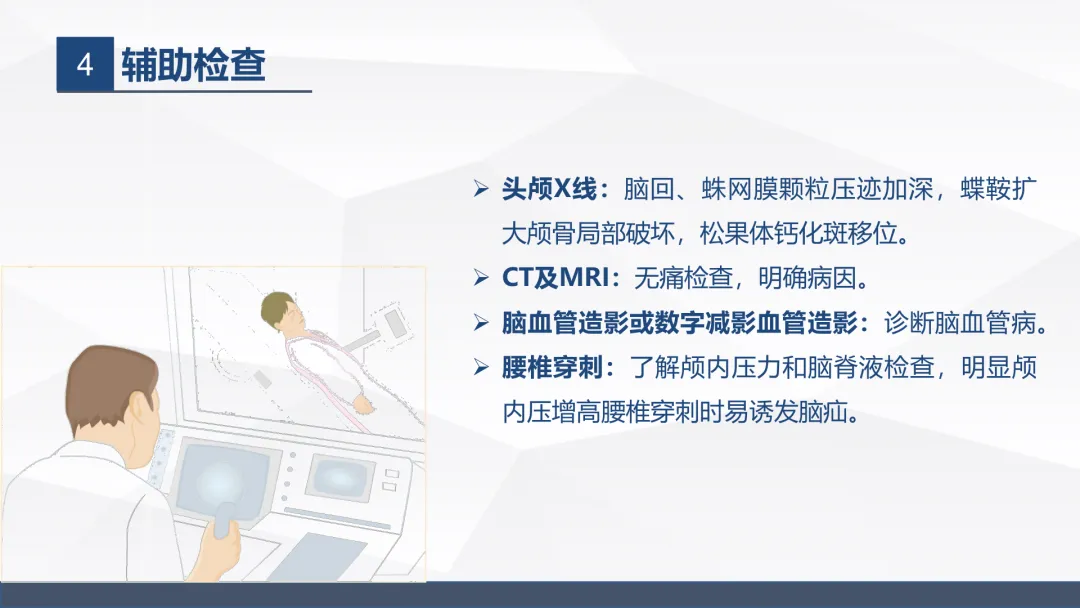 头颅 X 线:脑回、蛛网膜颗粒压迹加深,蝶鞍扩大,颅骨局部破坏,松果体钙化斑移位