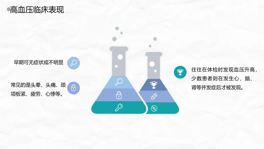 - 早期可无症状或不明显,往往在体检时发现血压升高,少数患者则在发生心、脑、肾等并发症后才被发现。