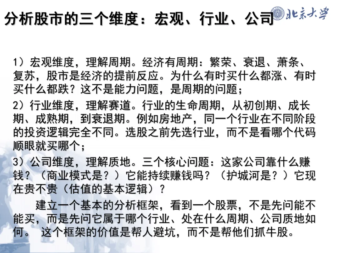 然后以宏观、行业、公司三个维度的基本分析框架,这是最基本的避坑!--不是先问能不能买,而是先问自己属于哪个行业、处在什么周期、公司质地如何。
