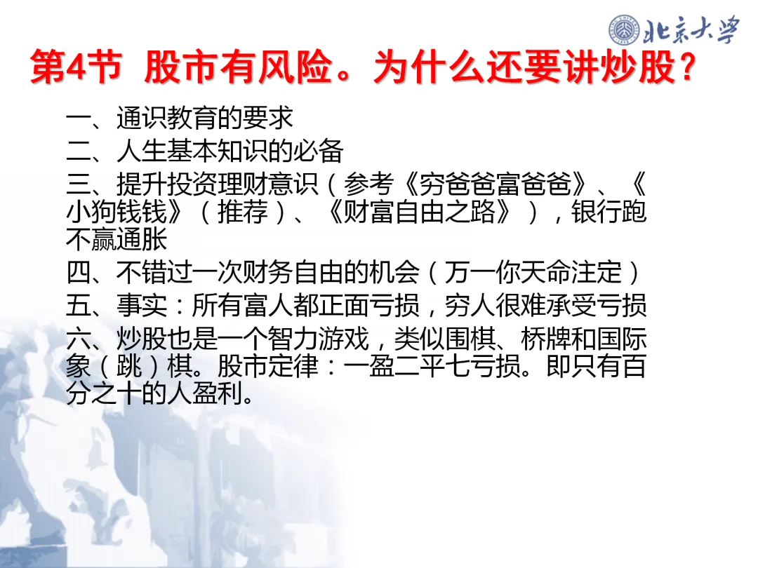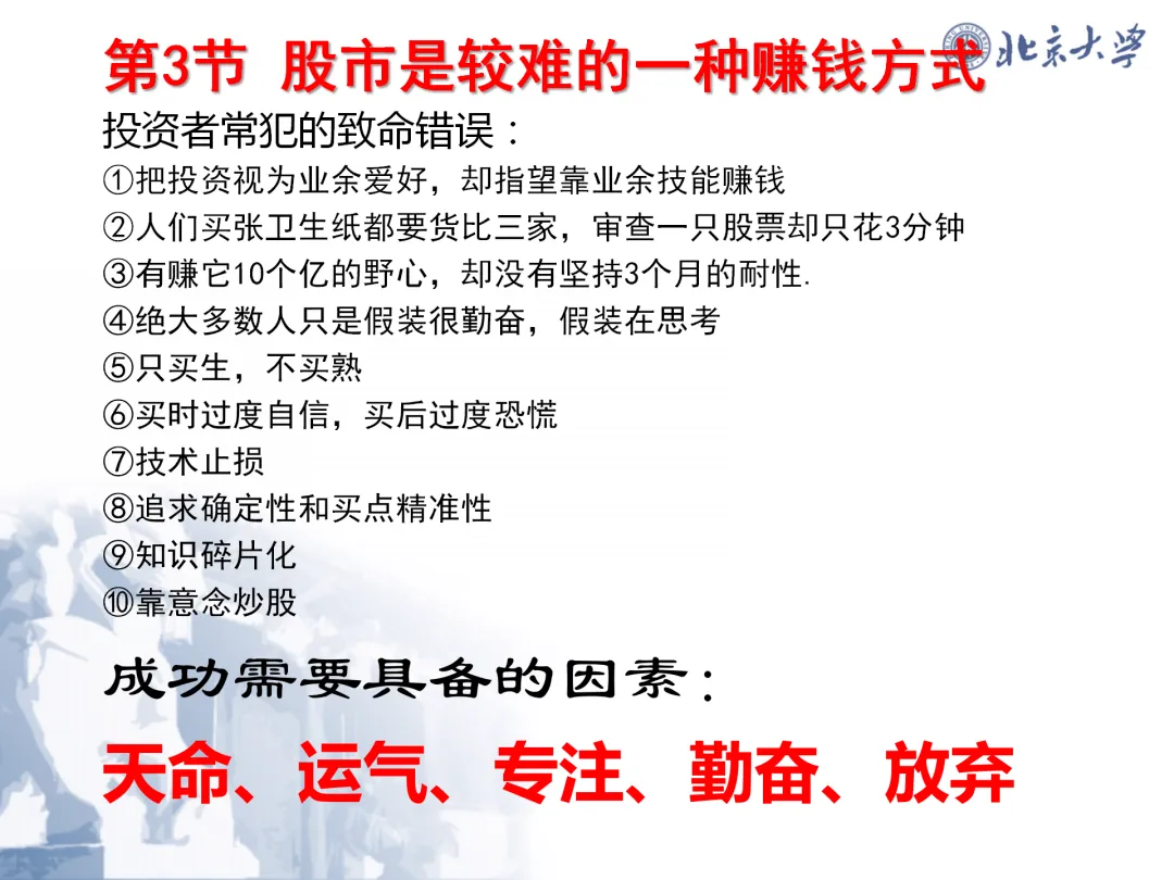 近日,北京大学物理系赵克常教授主讲的《地震概论》课堂主题为"炒股挣钱”的PPT意外火了,赵教授的课是北大选课人数最多的通选课之一,分享了他自己对股市投资的独到见解。