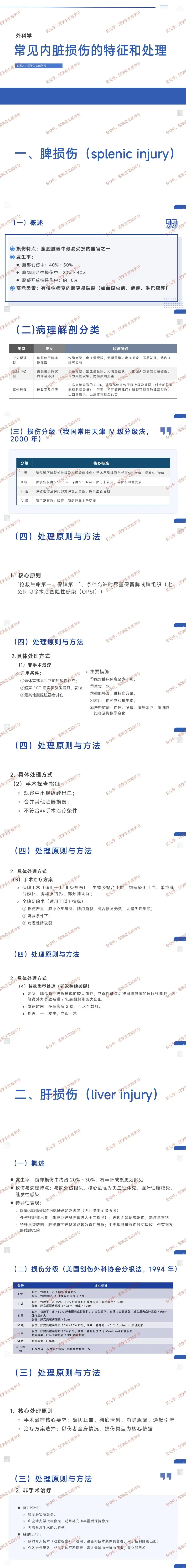 - 病理解剖分类:中央型破裂(脾实质深部,包膜完整)、包膜下破裂(周边部分,易迟发破裂)、真性破裂(累及包膜,占 85%,脾门撕裂可迅速休克)。