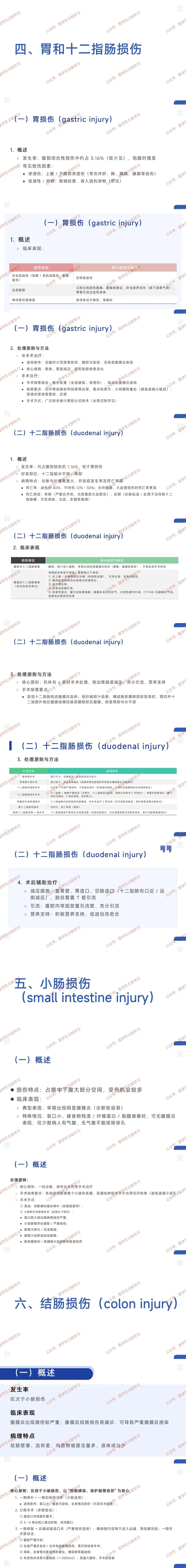 - 处理:小范围损伤可非手术观察;全层破裂或穿透伤需手术,探查时切开胃结肠韧带检查后壁,可行修补术或胃部分切除术。