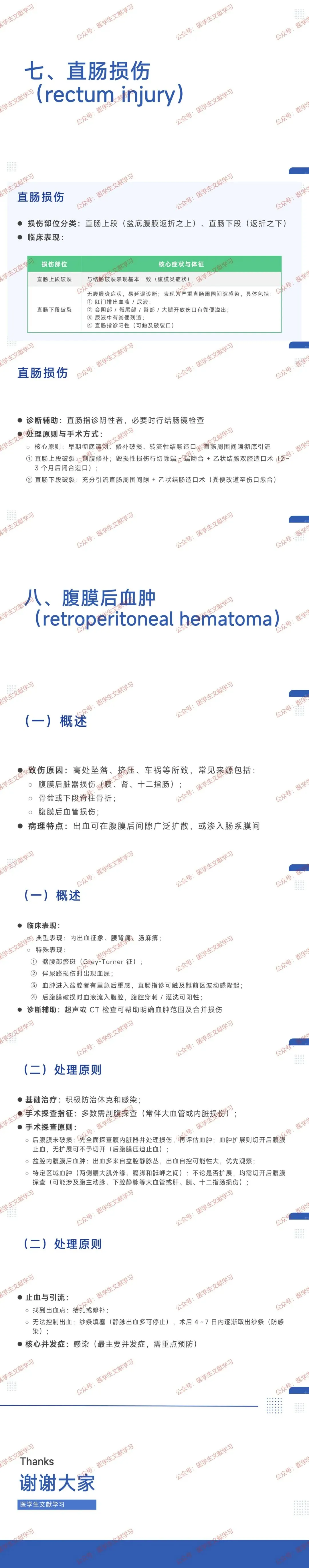 - 临床表现:内出血征象、腰背痛、肠麻痹,髂腰部瘀斑(Grey-Turner 征),盆腔血肿可出现里急后重。