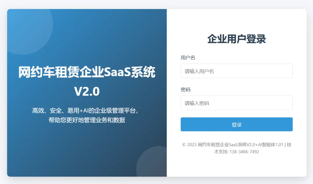 网约车租售、车辆管理、司机管理、智能风控、租金催收、企业管理……这套SaaS系统承包了租赁公司的所有管理难题,员工离职就断档?出问题相互扯皮,一套系统让您的租赁公司告别“原始社会”,效率翻倍,——网约车租赁老板必看的降本增效方案。管理乱:车辆状态不明、合同信息分散、财务账目混乱、员工工作交接困难。