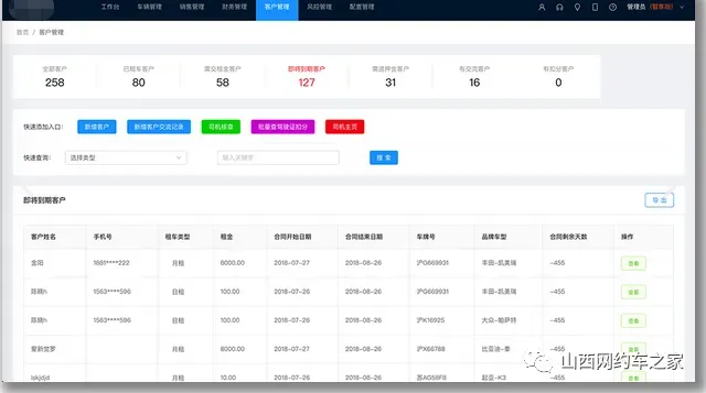 | 即将到期客户 | 自动筛选合同即将到期的客户(租赁到期、保险到期、年检到期、以租代购尾款到期),提前30/15/7天预警 |