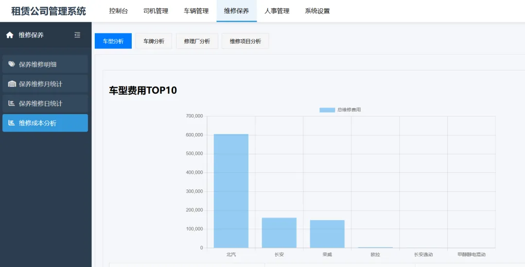 | 保养维修日统计 | 按日查看维修保养工单数量及费用,便于监控日常运维成本波动 |