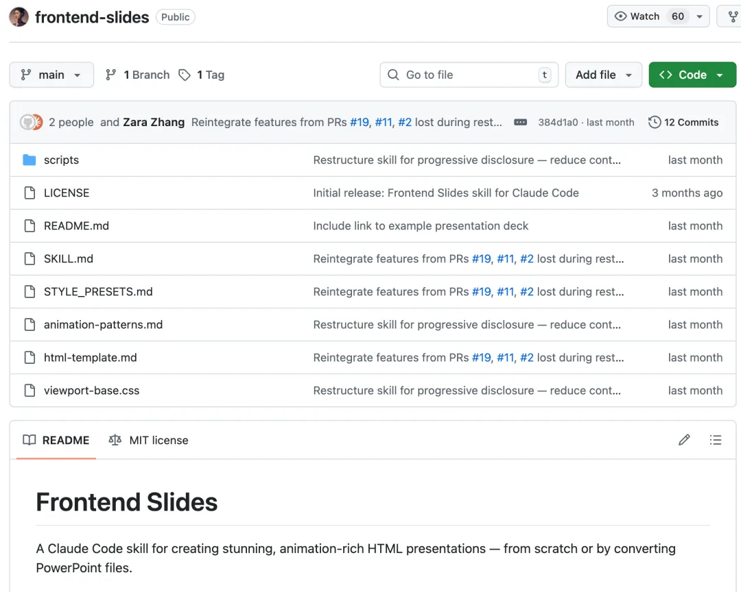 装好后 Claude Code 里输入 /frontend-slides 即可使用。