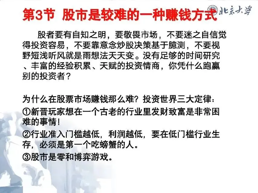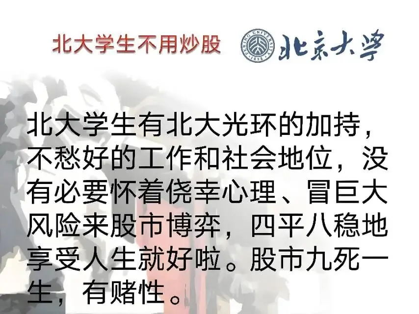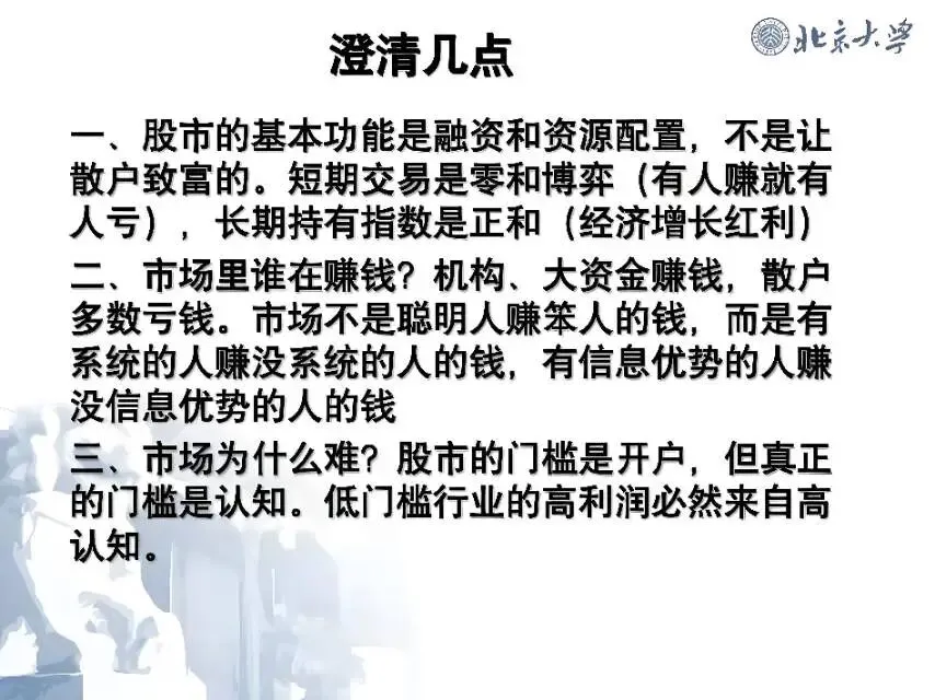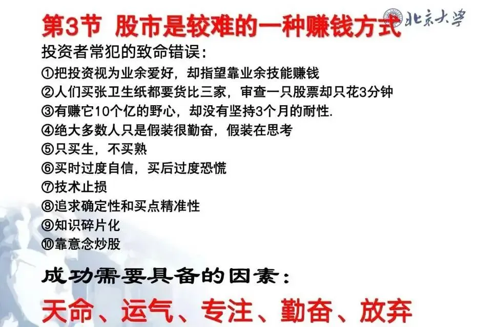 二、写在最后 这份北大炒股PPT,是一剂清醒剂。 它告诉我们:股市从来没有捷径,暴富的背后往往是陷阱。真正的长期盈利,靠的是认知的变现、纪律的坚守。 希望对大家有用!