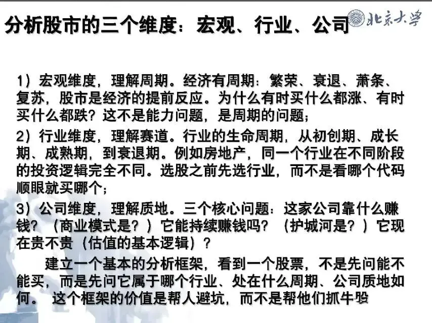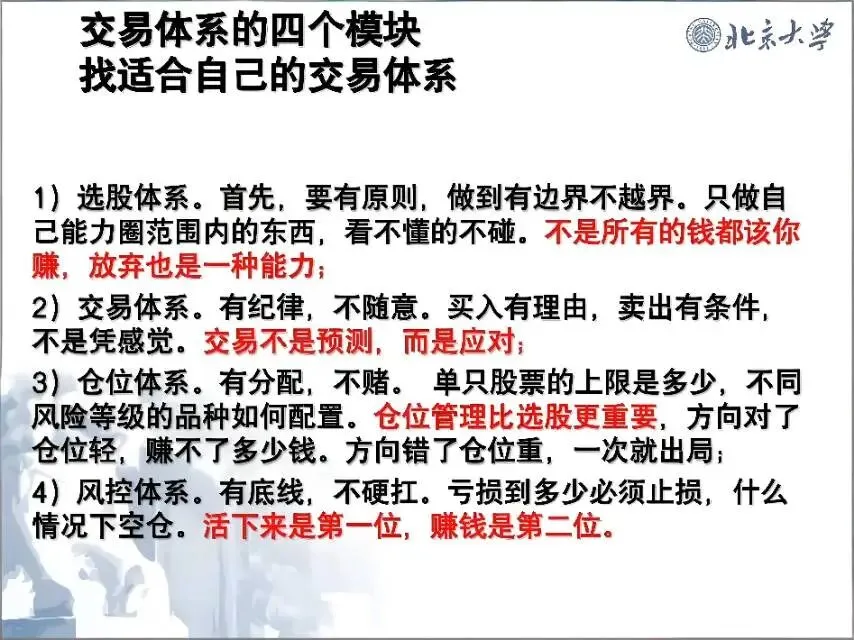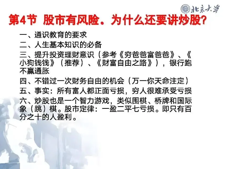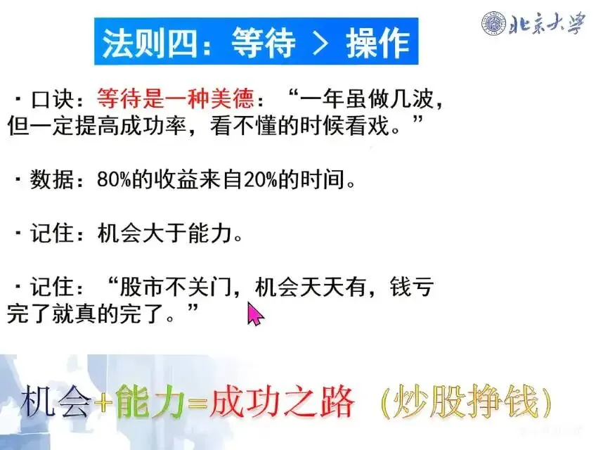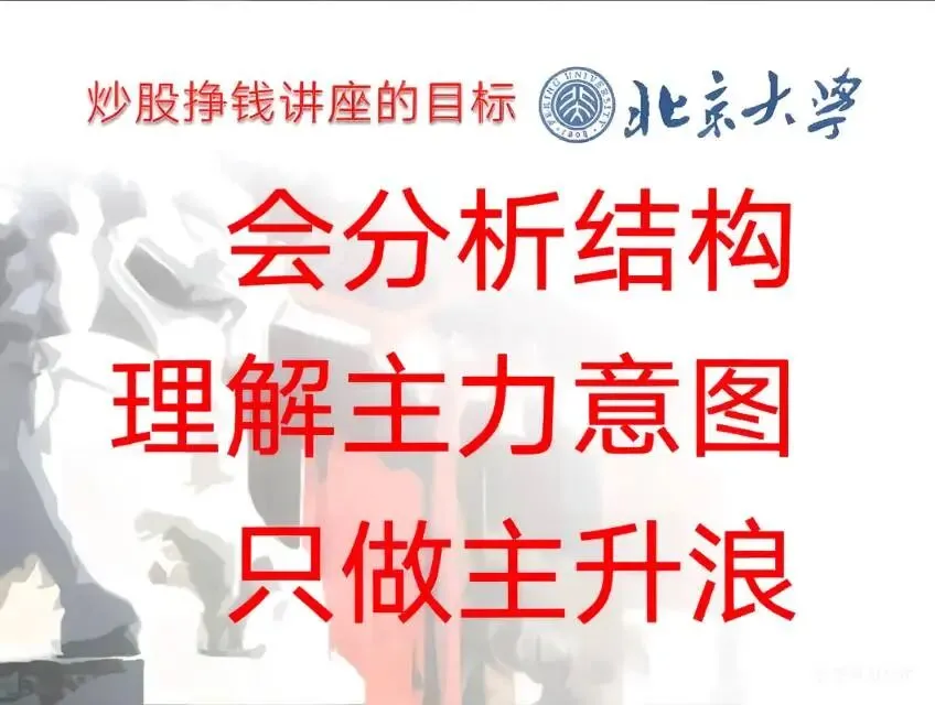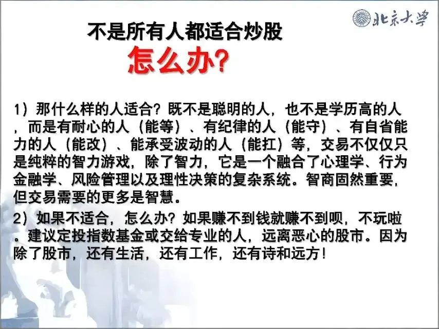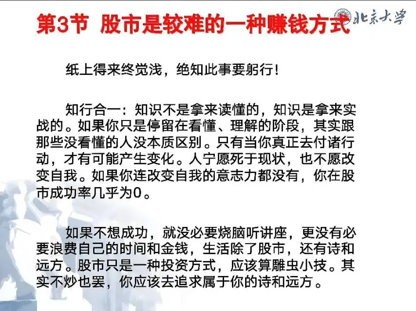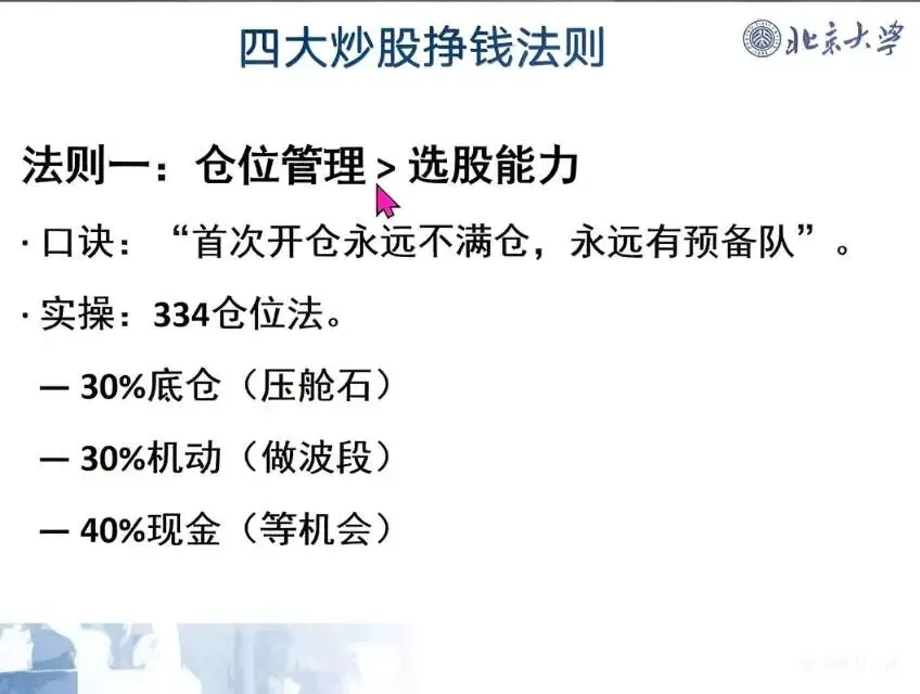 刷屏全网!北大65页炒股PPT完整版+深度点评,散户看完彻底清醒 最近投资圈彻底被一份北大65页炒股PPT霸屏,没有浮夸的暴富秘籍,没有难懂的专业术语,全是戳中散户痛点、直击投资本质的实在话,被股民称为“散户生存圣经”“股市劝退指南”。 很多人看了直呼“太真实”,终于明白自己在股市亏钱的根源。今天就把这份PPT核心内容整理出来,配上深度点评和实操补充,最后贴上高清原图,供大家收藏细读。 一、深度点评:这份PPT到底讲透了什么? 这份PPT之所以能刷屏,核心在于不制造焦虑、不鼓吹暴富,只讲真话。它看似讲炒股,实则讲的是认知、纪律和人性。 1. 打破暴富幻想,先有敬畏心 绝大多数散户入市,都抱着“轻松赚快钱”的幻想,却忽略了信息、资金上的全面劣势。PPT开篇直接泼冷水:股市不是散户的提款机。 让散户认清自己在市场金字塔底层的位置,放下不切实际的幻想,敬畏市场,是投资的第一步。 2. 重纪律轻技术,纠正核心误区 散户炒股最爱研究K线、指标,却往往忽略最致命的纪律和风控。PPT明确指出:仓位管理比选股重要,止损纪律比预测重要。 很多人亏在赚了一点就跑,亏了一点死扛。没有纪律的投资,就像没有刹车的车,早晚会出事。 3. 接地气可落地,普通人直接套用 不同于晦涩的书籍,PPT里的方法全是能直接套用的实操:334仓位法、5%止损线、股市四季战法。 它不教你精准预测涨跌,而是教你如何控制风险、如何等待机会。对于散户而言,不需要成为专家,把这些简单准则执行到位,就能跑赢大多数股民。 4. 认清边界,理性选择 最难得的是,PPT直言“不是所有人都适合炒股”。 投资的终极智慧,是认清自己的能力圈。没耐心、无纪律、承受不住波动的人,建议定投指数基金,别硬扛。 下面贴上全文,拿去用: