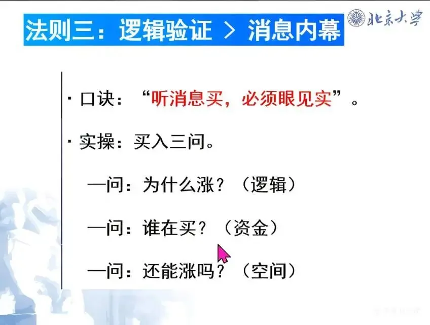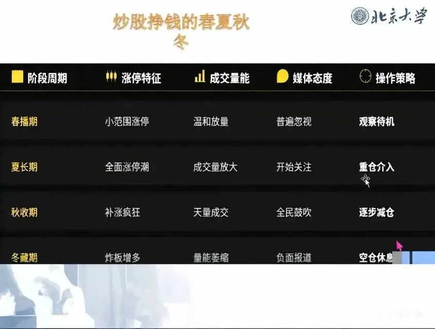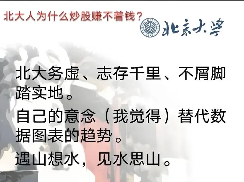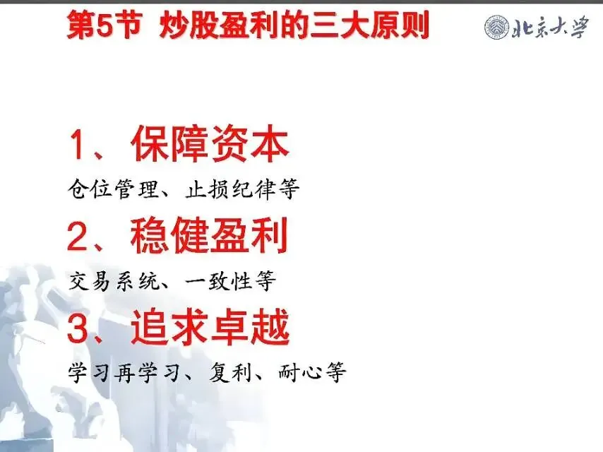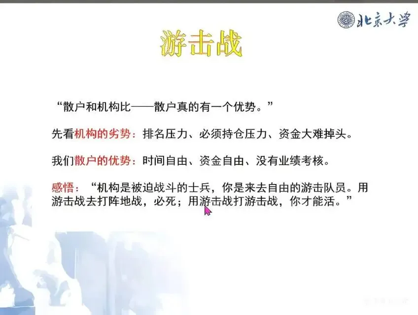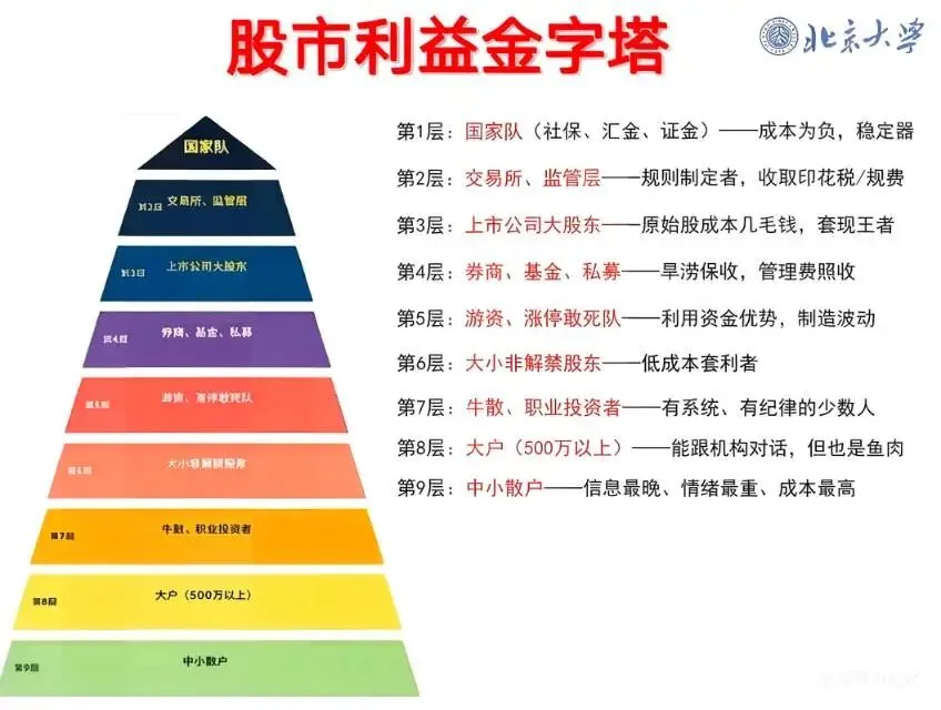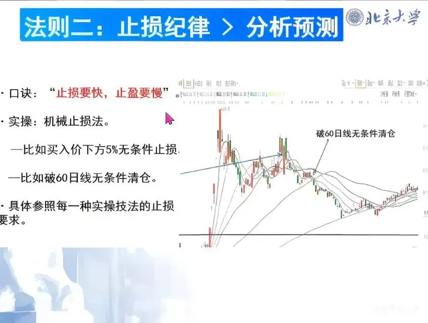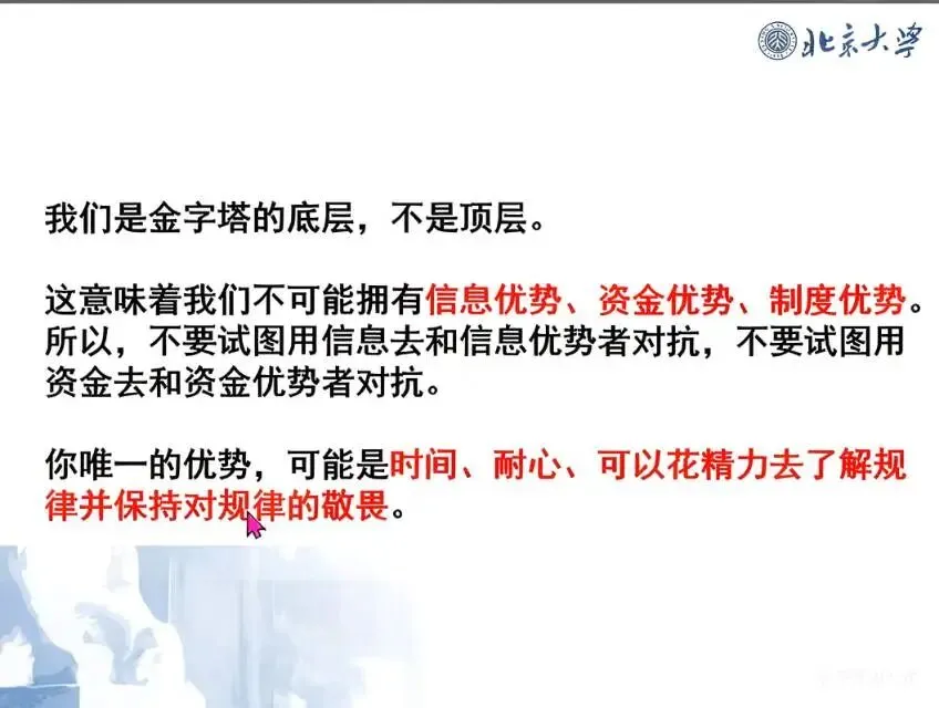 刷屏全网!北大65页炒股PPT完整版+深度点评,散户看完彻底清醒 最近投资圈彻底被一份北大65页炒股PPT霸屏,没有浮夸的暴富秘籍,没有难懂的专业术语,全是戳中散户痛点、直击投资本质的实在话,被股民称为“散户生存圣经”“股市劝退指南”。 很多人看了直呼“太真实”,终于明白自己在股市亏钱的根源。今天就把这份PPT核心内容整理出来,配上深度点评和实操补充,最后贴上高清原图,供大家收藏细读。 一、深度点评:这份PPT到底讲透了什么? 这份PPT之所以能刷屏,核心在于不制造焦虑、不鼓吹暴富,只讲真话。它看似讲炒股,实则讲的是认知、纪律和人性。 1. 打破暴富幻想,先有敬畏心 绝大多数散户入市,都抱着“轻松赚快钱”的幻想,却忽略了信息、资金上的全面劣势。PPT开篇直接泼冷水:股市不是散户的提款机。 让散户认清自己在市场金字塔底层的位置,放下不切实际的幻想,敬畏市场,是投资的第一步。 2. 重纪律轻技术,纠正核心误区 散户炒股最爱研究K线、指标,却往往忽略最致命的纪律和风控。PPT明确指出:仓位管理比选股重要,止损纪律比预测重要。 很多人亏在赚了一点就跑,亏了一点死扛。没有纪律的投资,就像没有刹车的车,早晚会出事。 3. 接地气可落地,普通人直接套用 不同于晦涩的书籍,PPT里的方法全是能直接套用的实操:334仓位法、5%止损线、股市四季战法。 它不教你精准预测涨跌,而是教你如何控制风险、如何等待机会。对于散户而言,不需要成为专家,把这些简单准则执行到位,就能跑赢大多数股民。 4. 认清边界,理性选择 最难得的是,PPT直言“不是所有人都适合炒股”。 投资的终极智慧,是认清自己的能力圈。没耐心、无纪律、承受不住波动的人,建议定投指数基金,别硬扛。 下面贴上全文,拿去用: