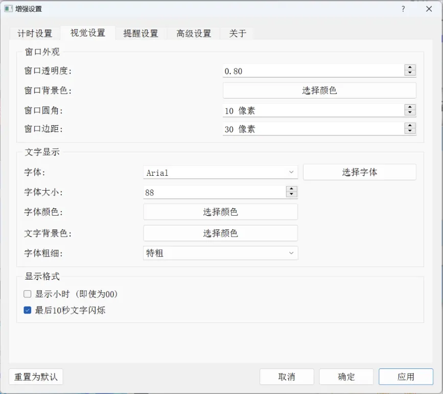 同时还能调整窗口透明度、背景色、字体大小和字体颜色,也可以设置最后 10 秒文字闪烁提醒。